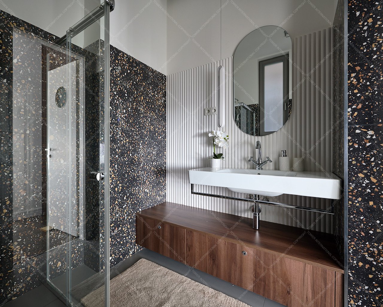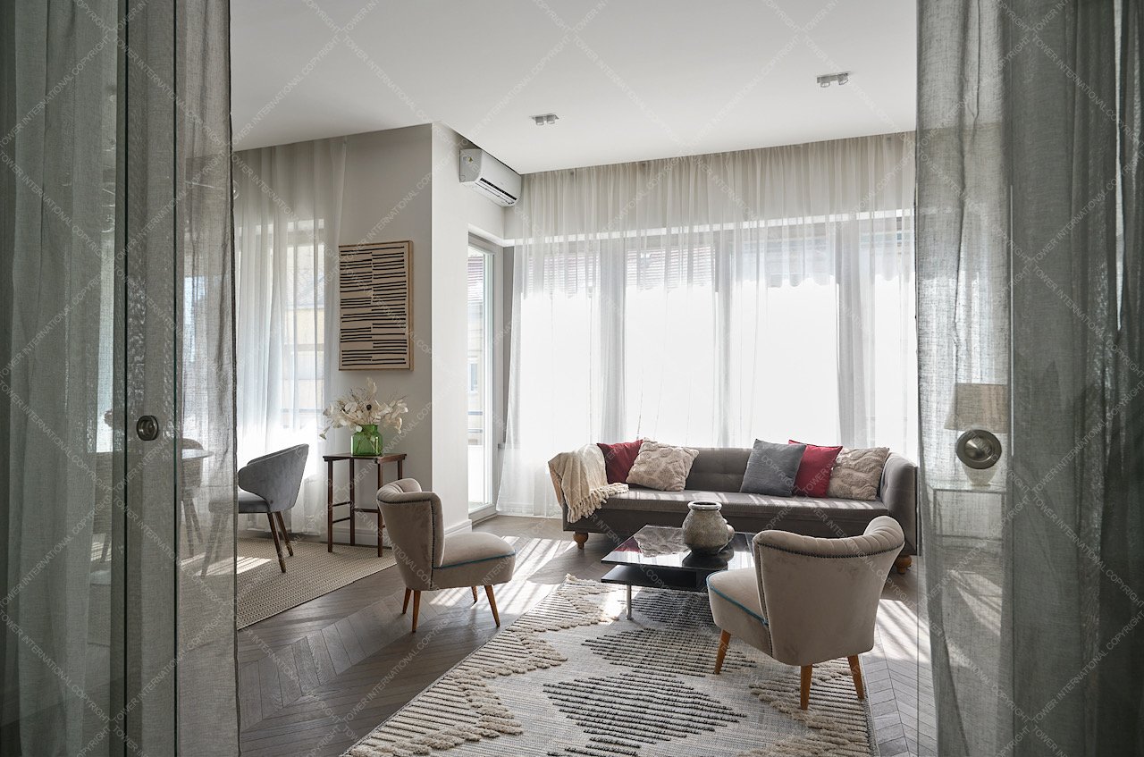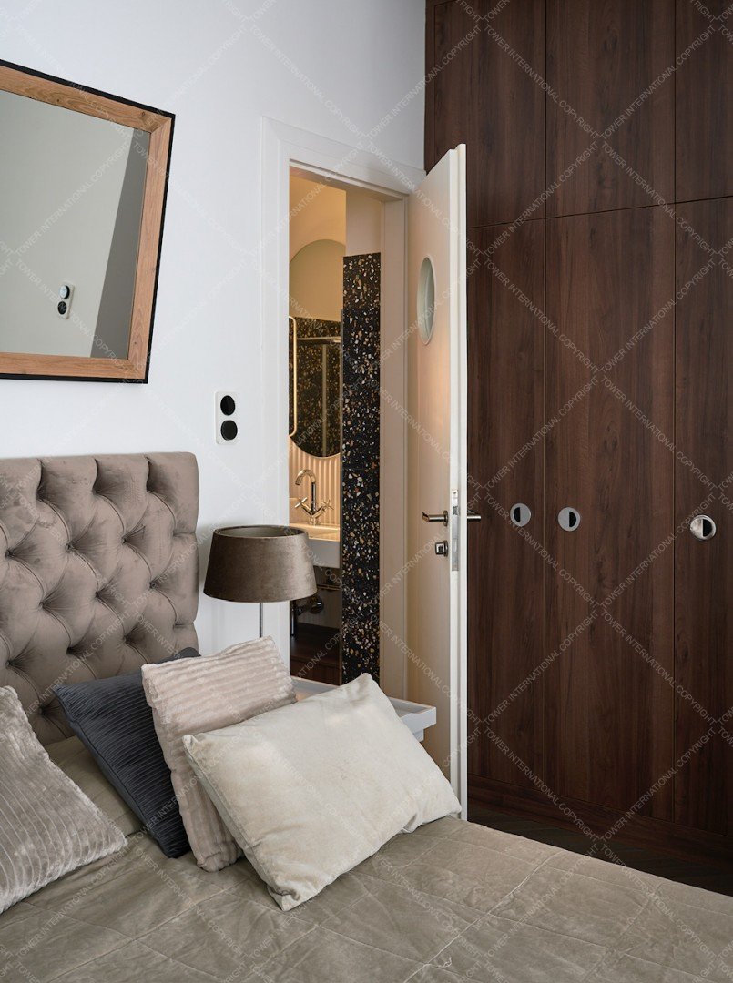 The apartment also includes a separate WC and a small laundry room. Large sound- and heat-insulated windows facing the street ensure bright interiors. All windows are fitted with automatic shutters.