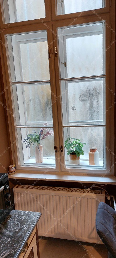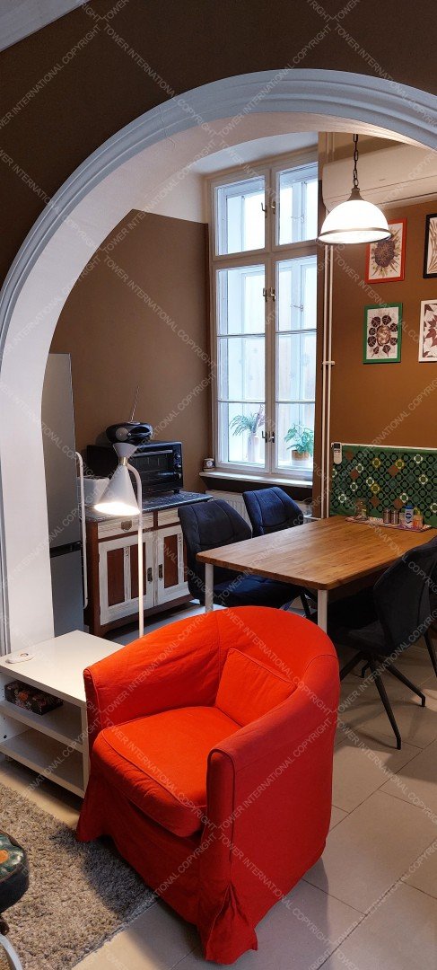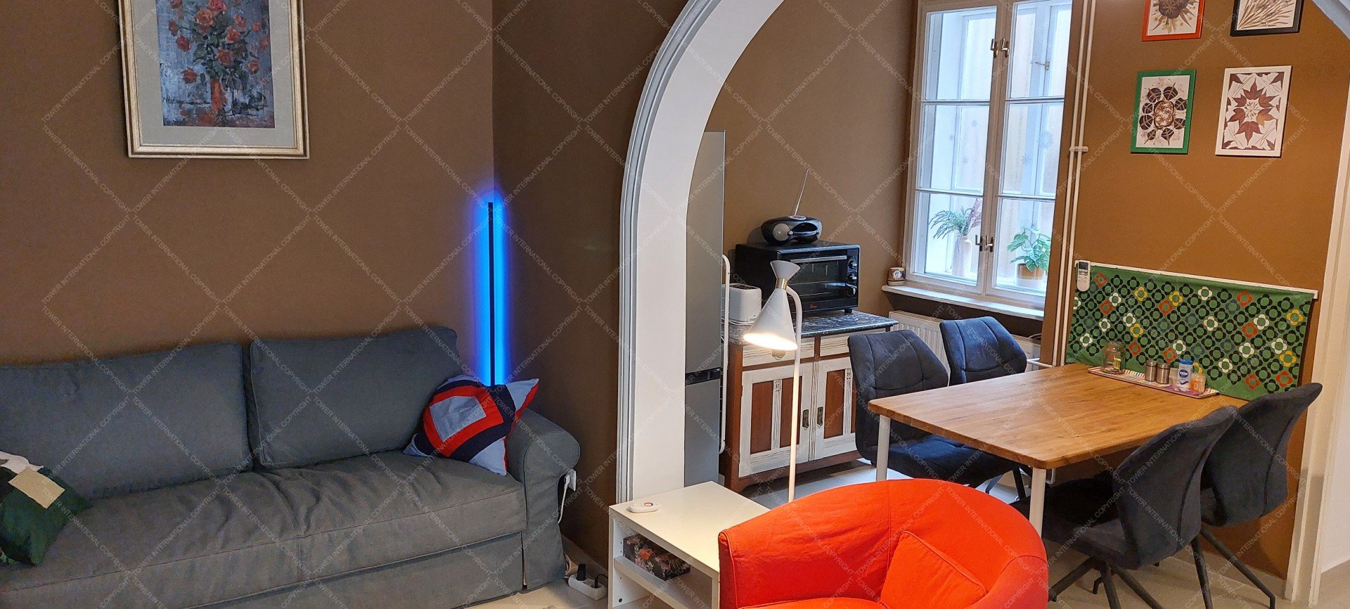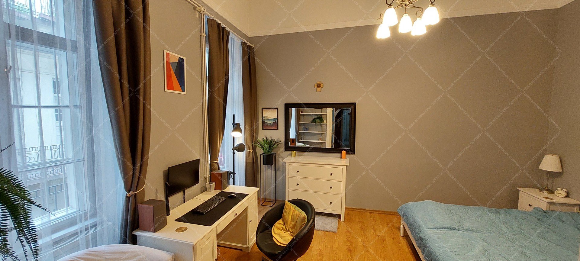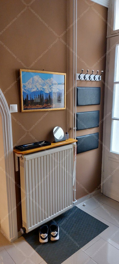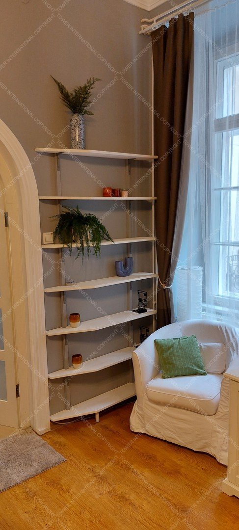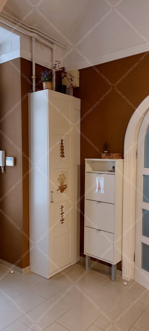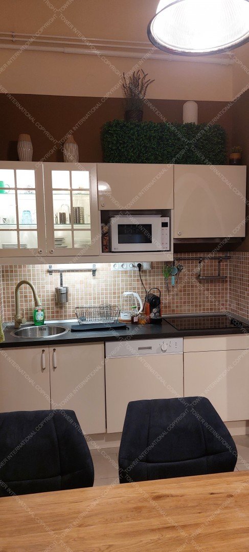 The ceiling height is about 4 metres and the rooms are bright. The apartment is furnished and equipped with air conditioning in the living room, washing machine in the bathroom and dishwasher in the kitchen. Hot water and heating is provided by a gas boiler. The apartment was redecorated in July 2024.