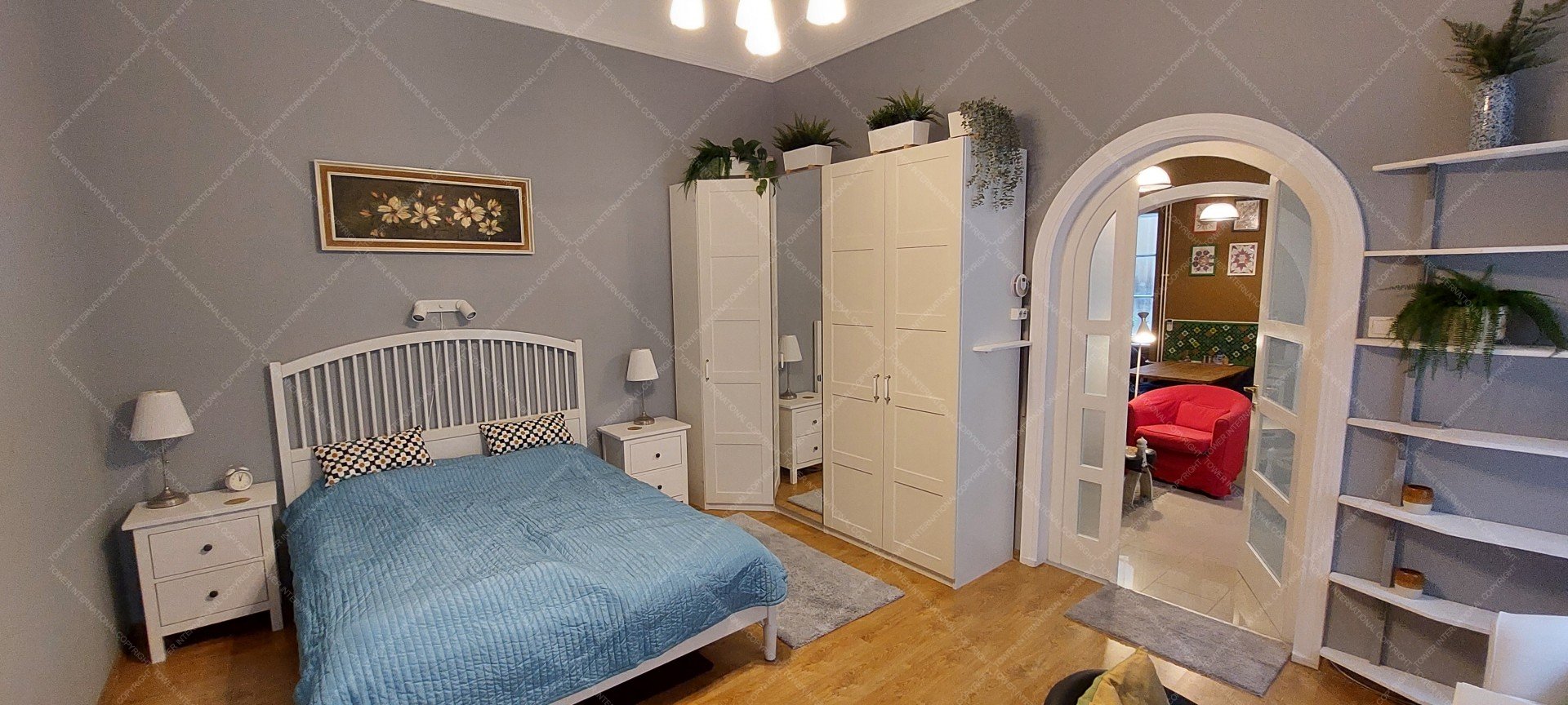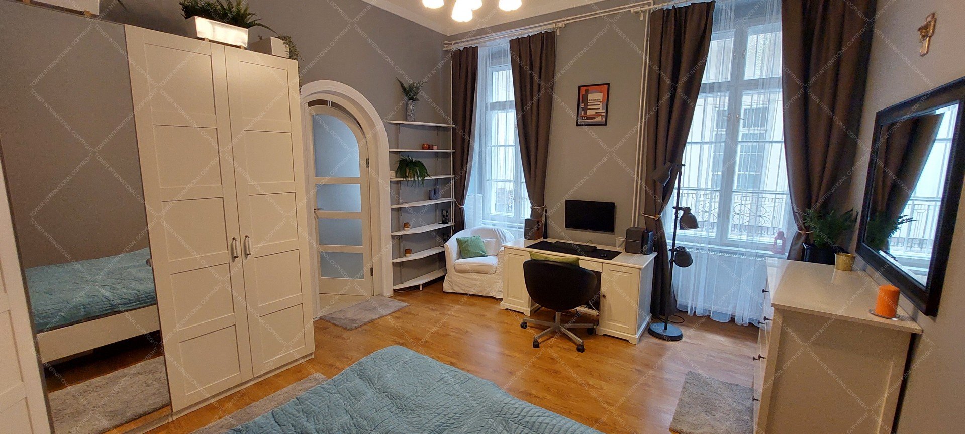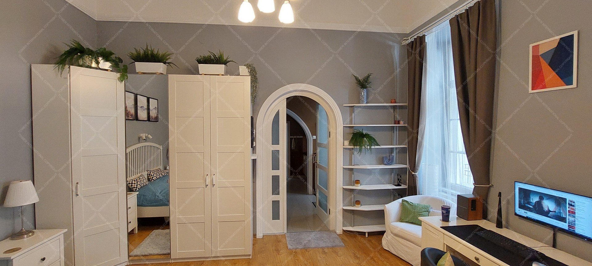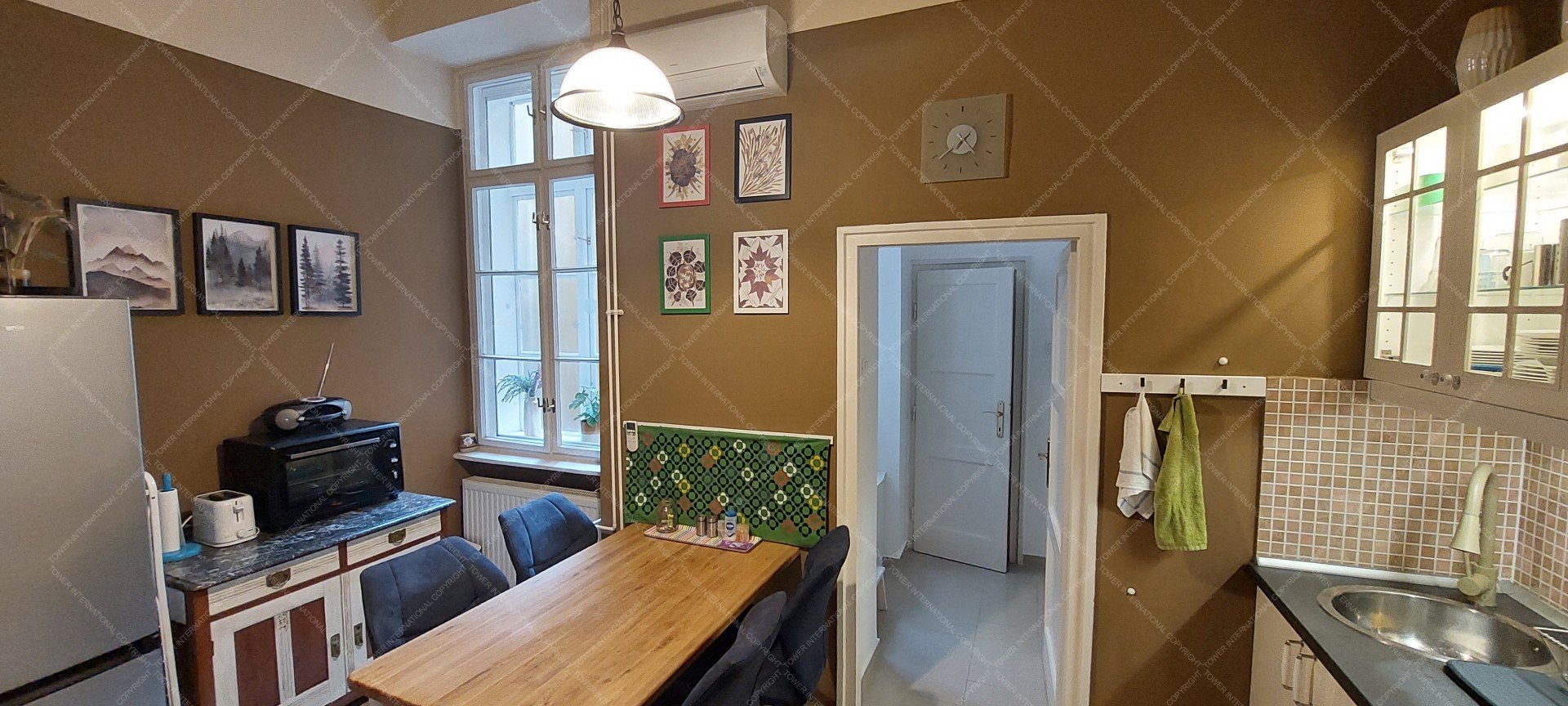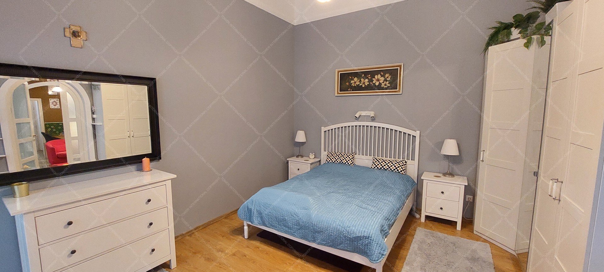 The ceiling height is about 4 metres and the rooms are bright. The apartment is furnished and equipped with air conditioning in the living room, washing machine in the bathroom and dishwasher in the kitchen. Hot water and heating is provided by a gas boiler. The apartment was redecorated in July 2024.