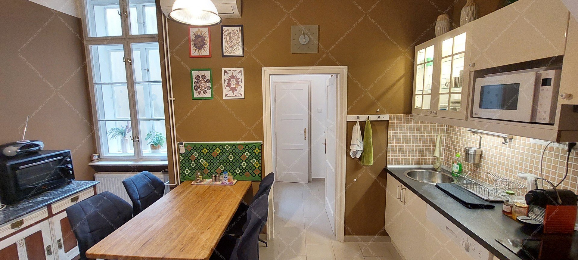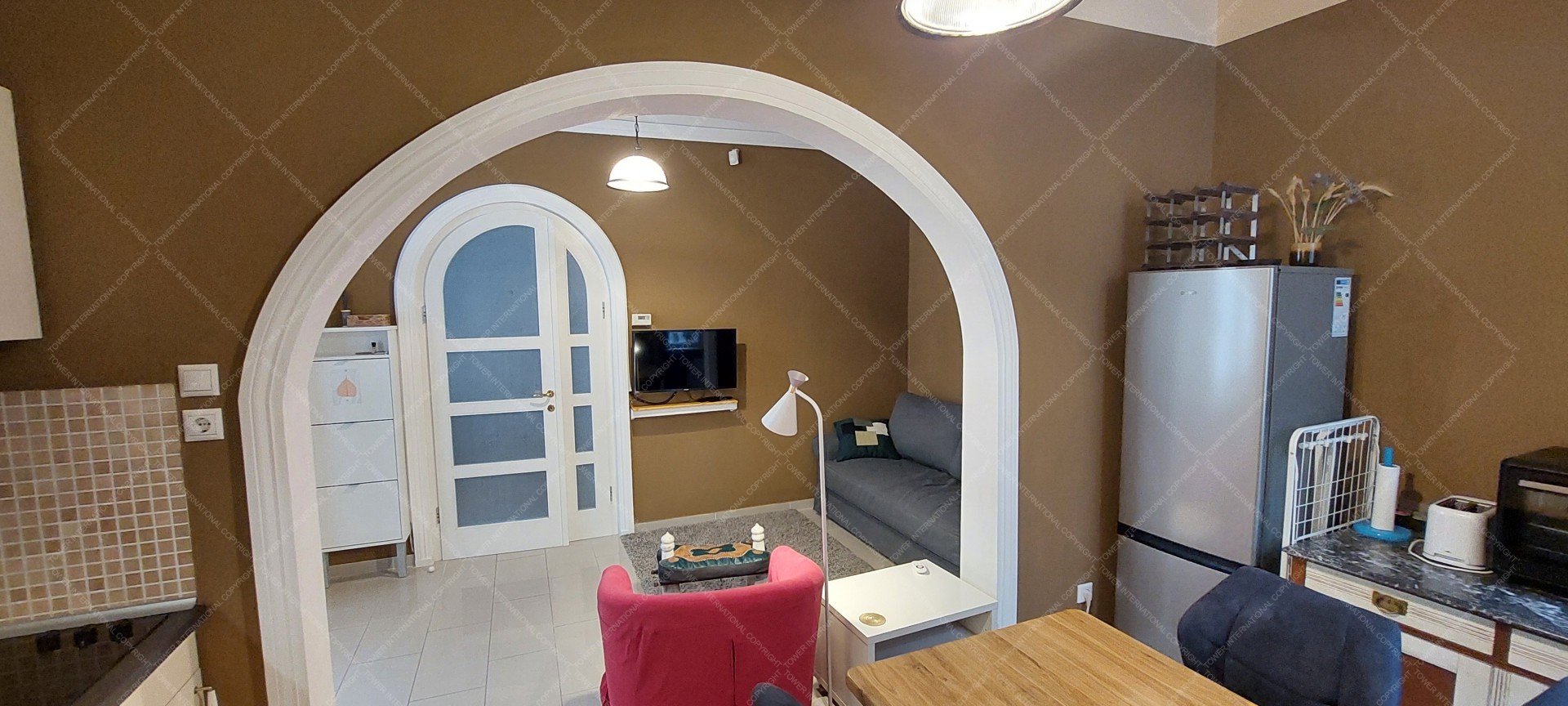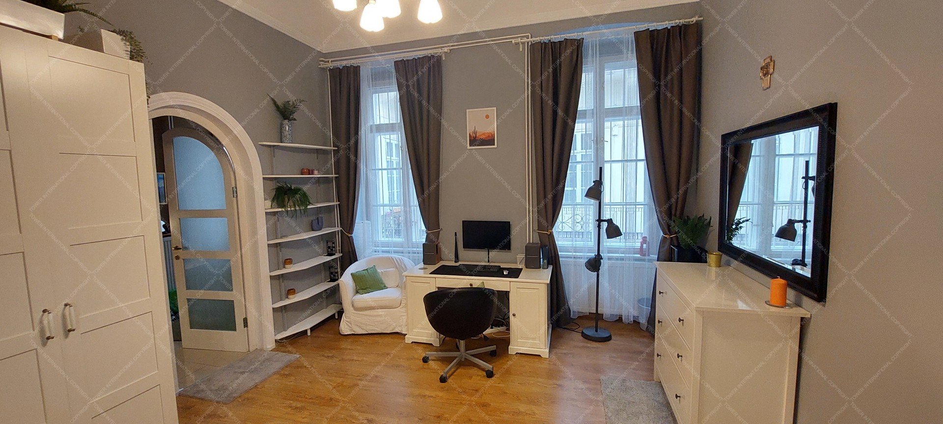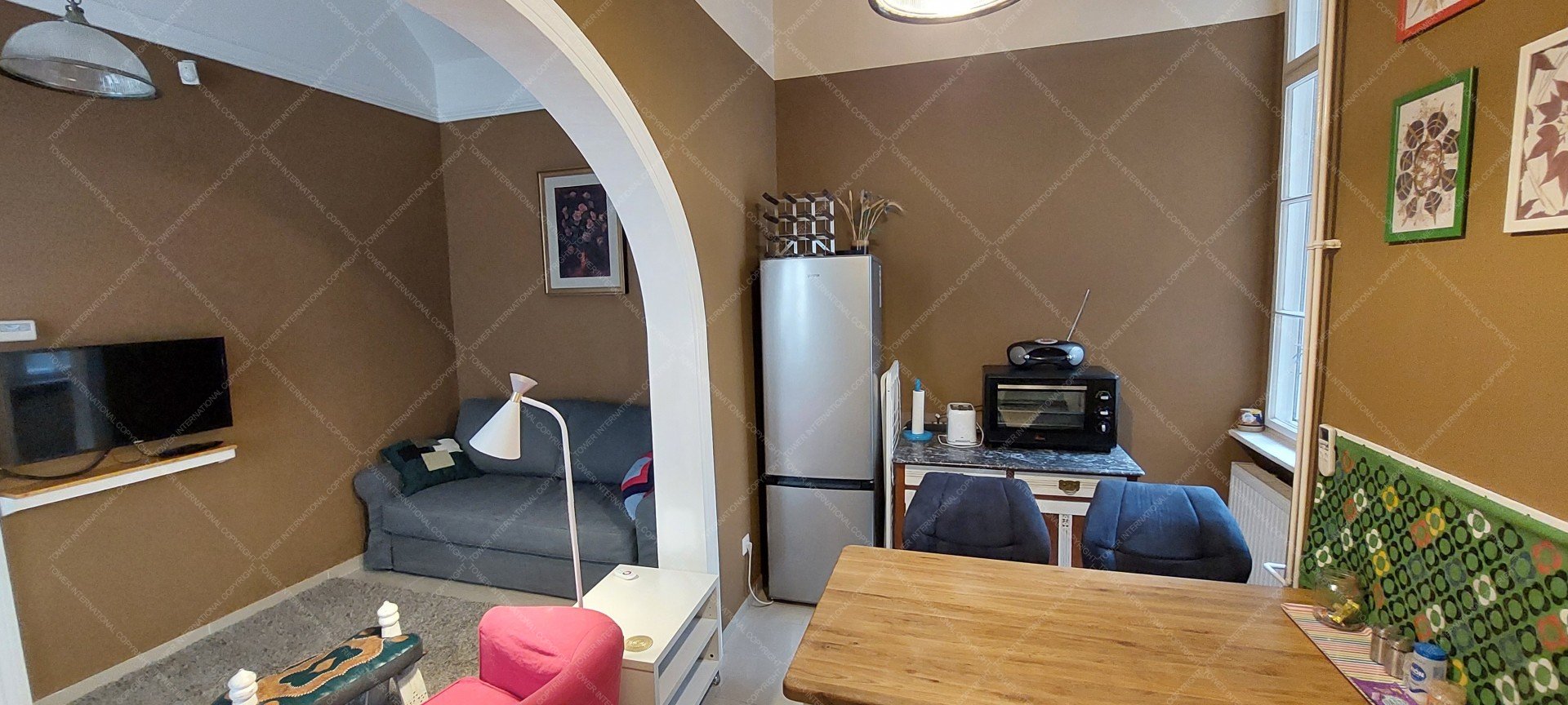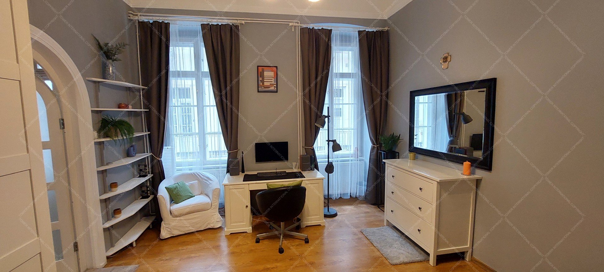 The ceiling height is about 4 metres and the rooms are bright. The apartment is furnished and equipped with air conditioning in the living room, washing machine in the bathroom and dishwasher in the kitchen. Hot water and heating is provided by a gas boiler. The apartment was redecorated in July 2024.