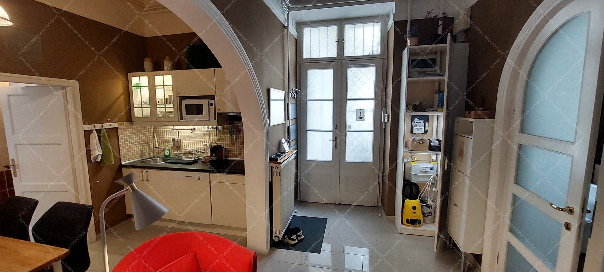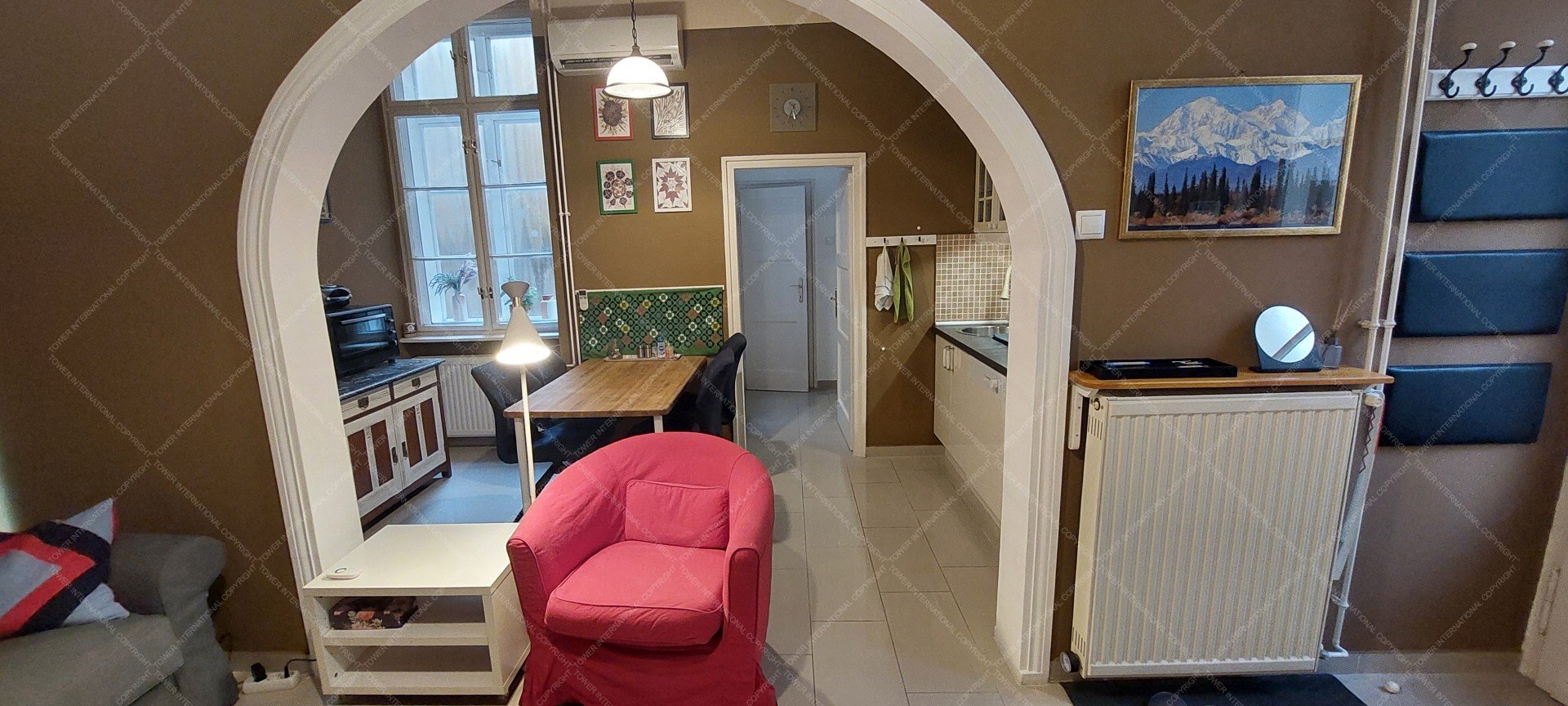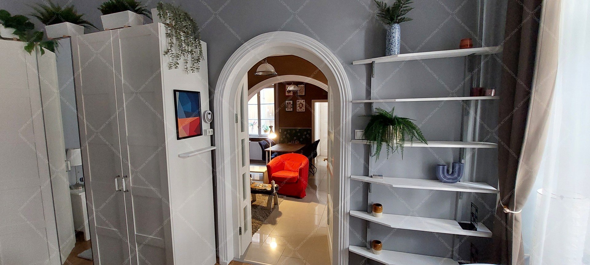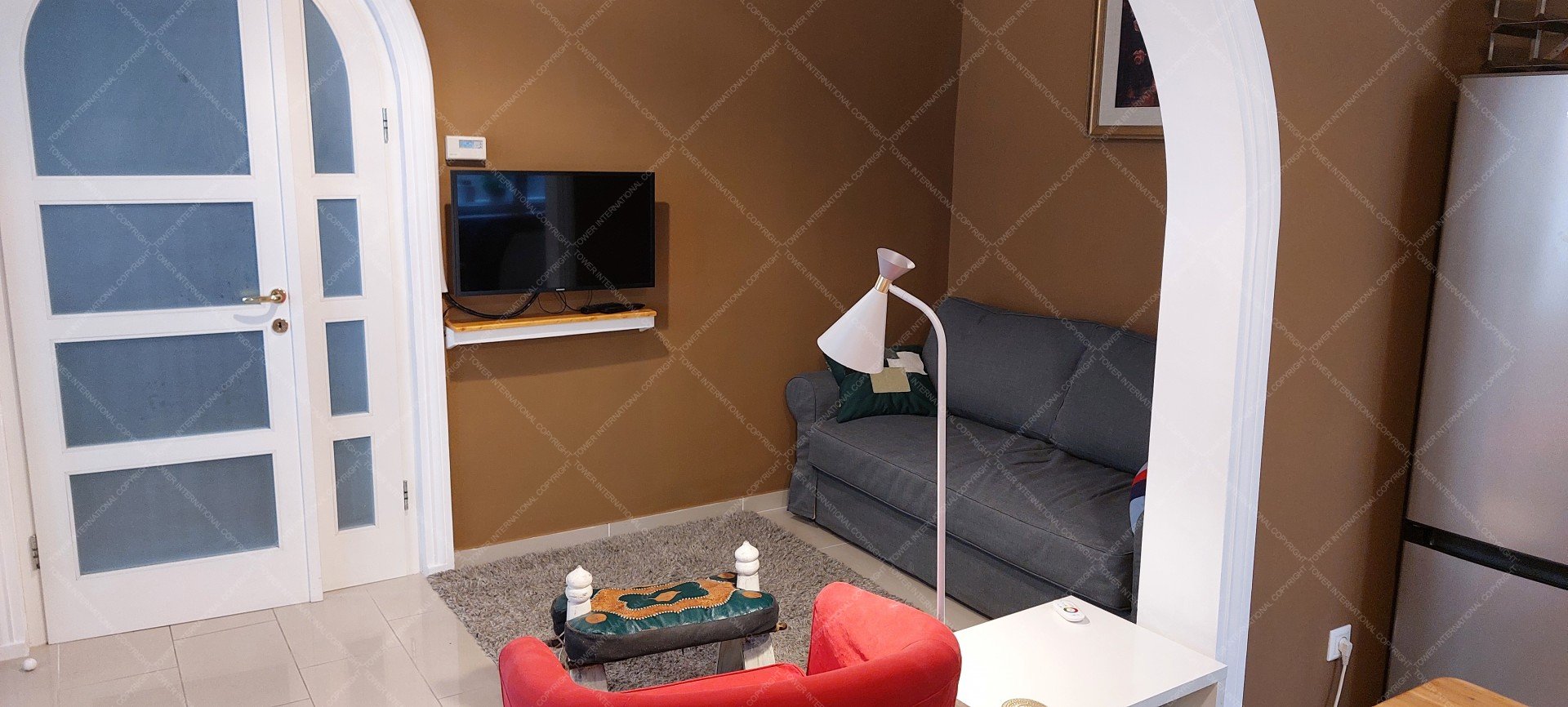 The ceiling height is about 4 metres and the rooms are bright. The apartment is furnished and equipped with air conditioning in the living room, washing machine in the bathroom and dishwasher in the kitchen. Hot water and heating is provided by a gas boiler. The apartment was redecorated in July 2024.