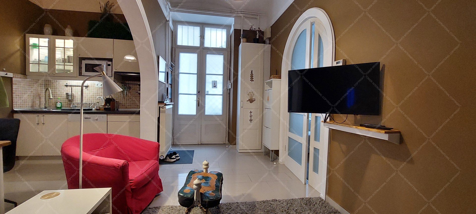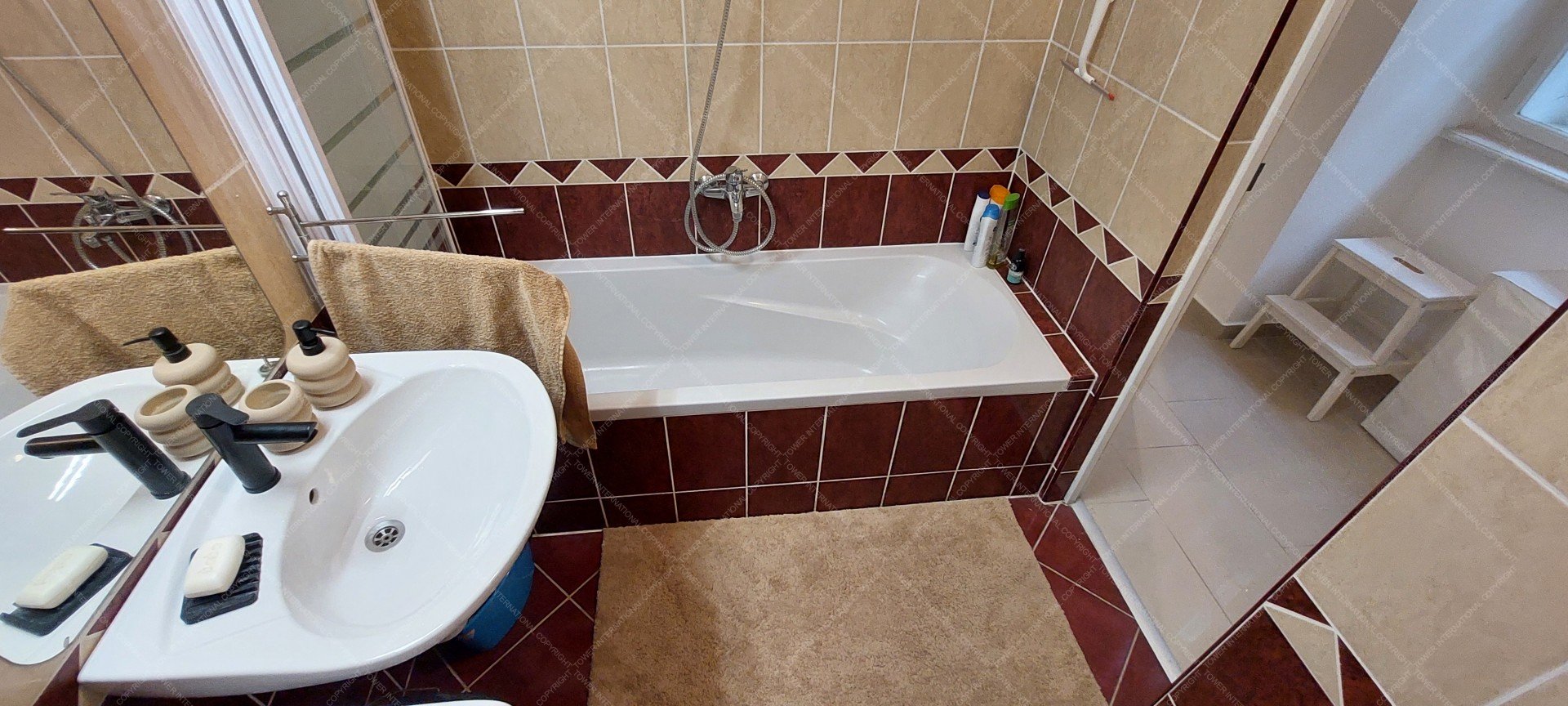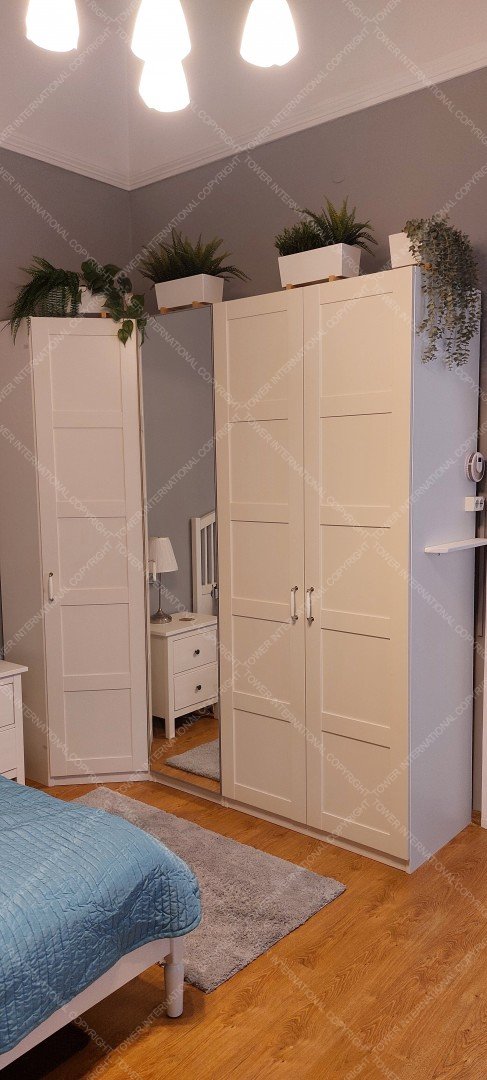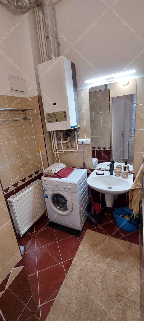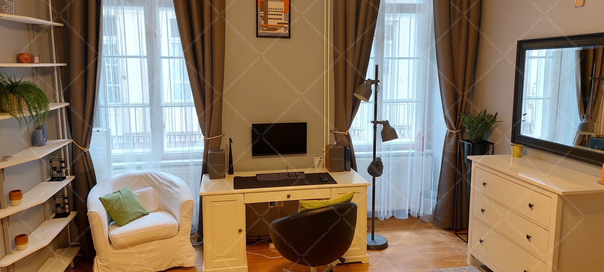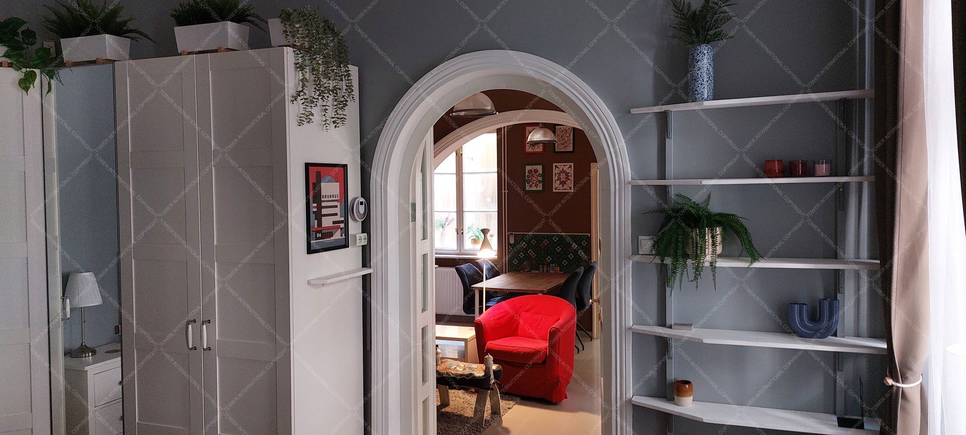 The ceiling height is about 4 metres and the rooms are bright. The apartment is furnished and equipped with air conditioning in the living room, washing machine in the bathroom and dishwasher in the kitchen. Hot water and heating is provided by a gas boiler. The apartment was redecorated in July 2024.