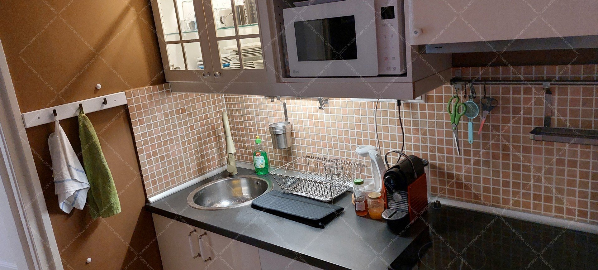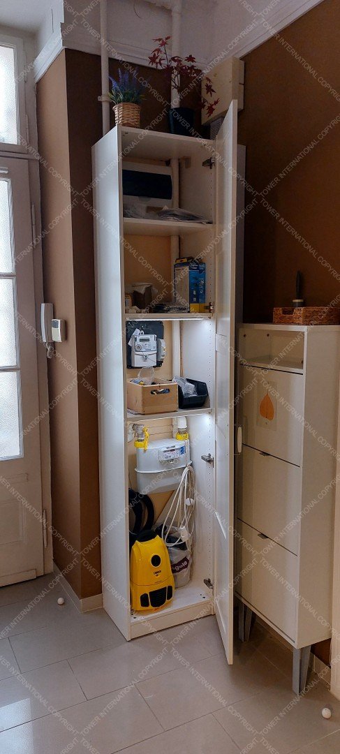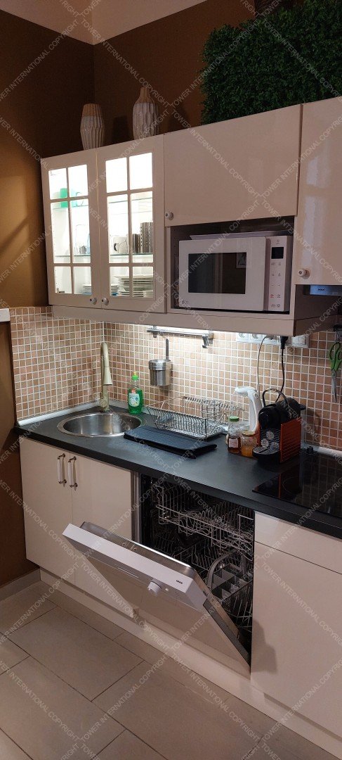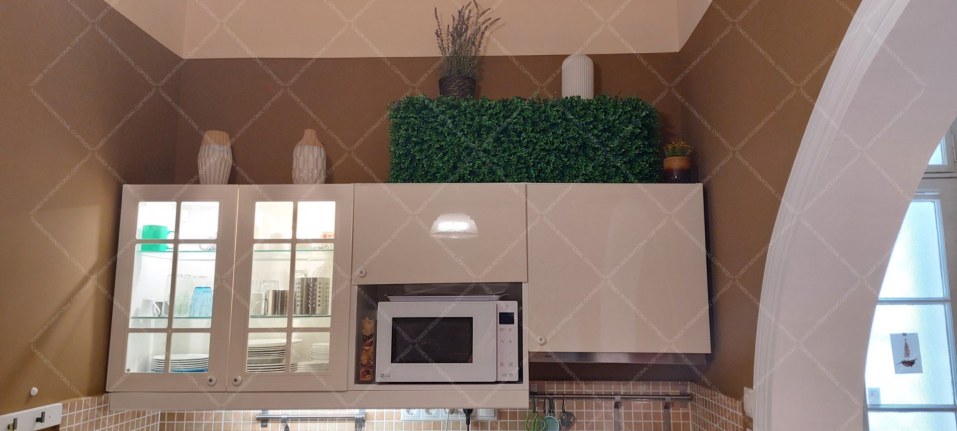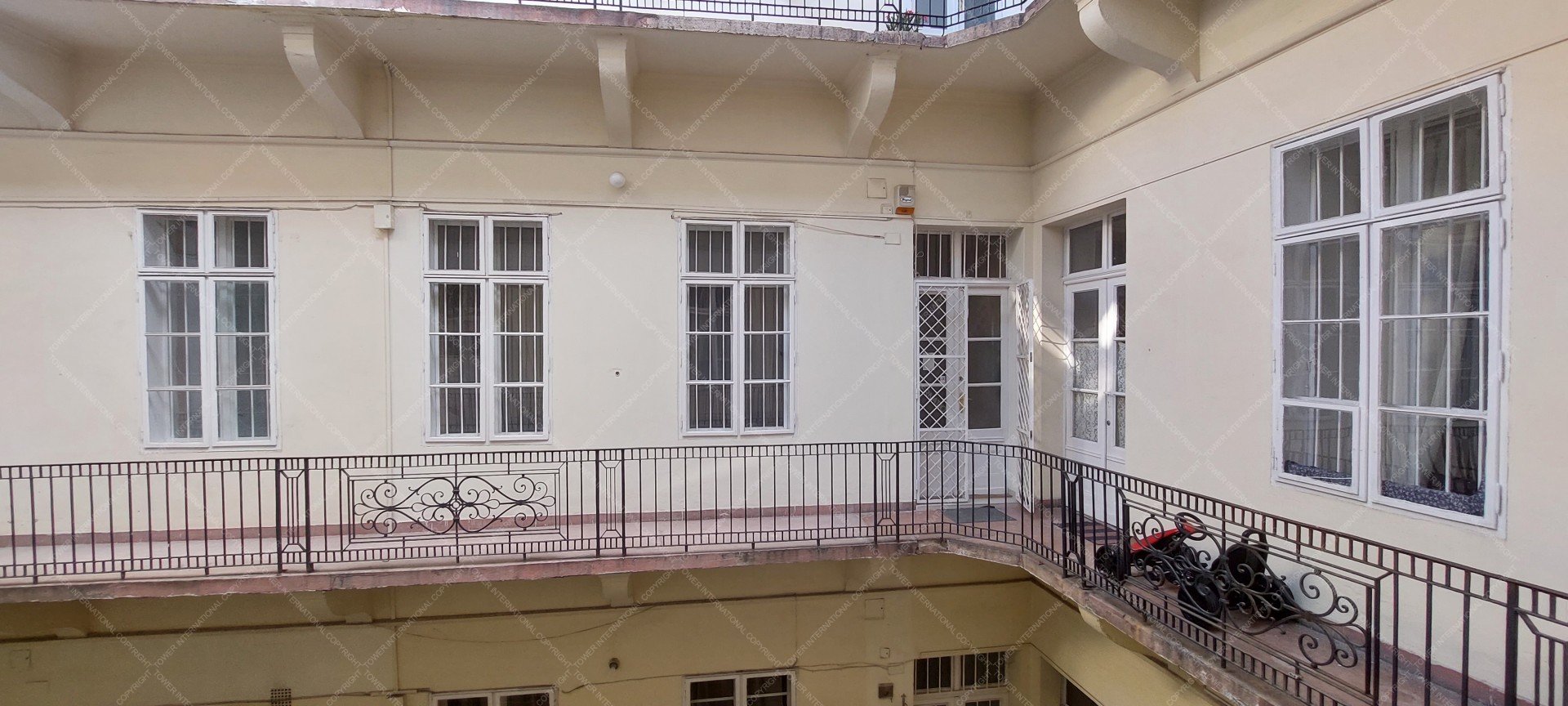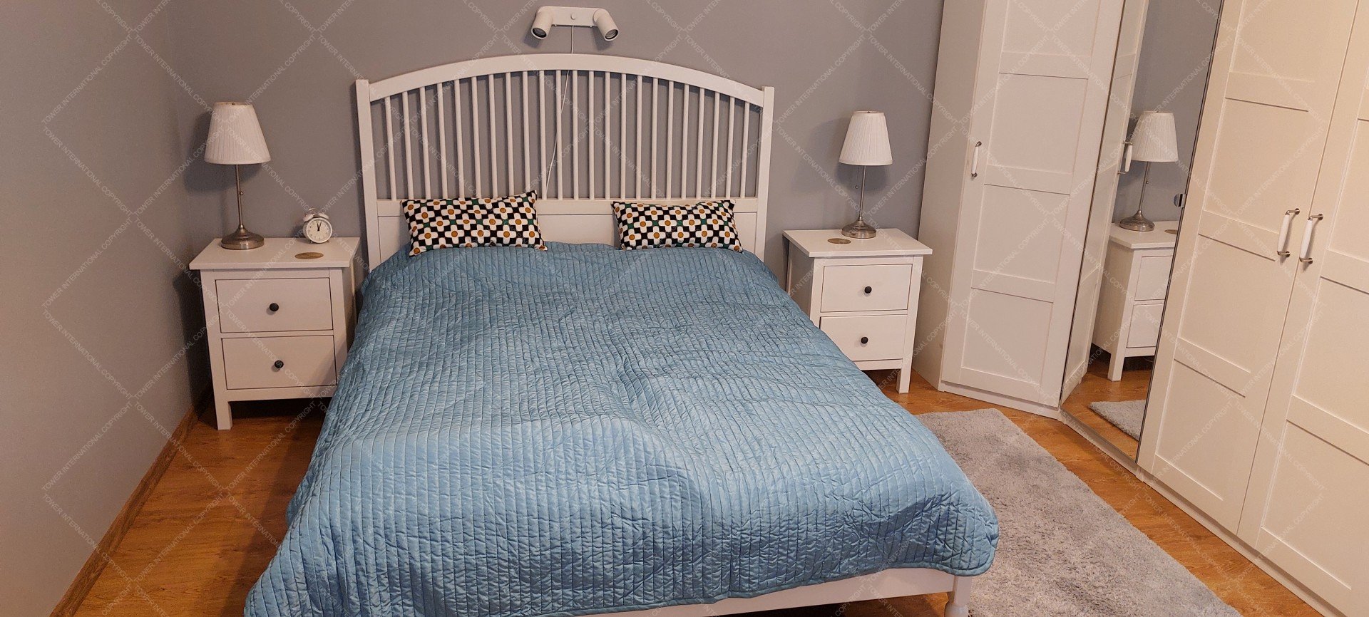 The ceiling height is about 4 metres and the rooms are bright. The apartment is furnished and equipped with air conditioning in the living room, washing machine in the bathroom and dishwasher in the kitchen. Hot water and heating is provided by a gas boiler. The apartment was redecorated in July 2024.