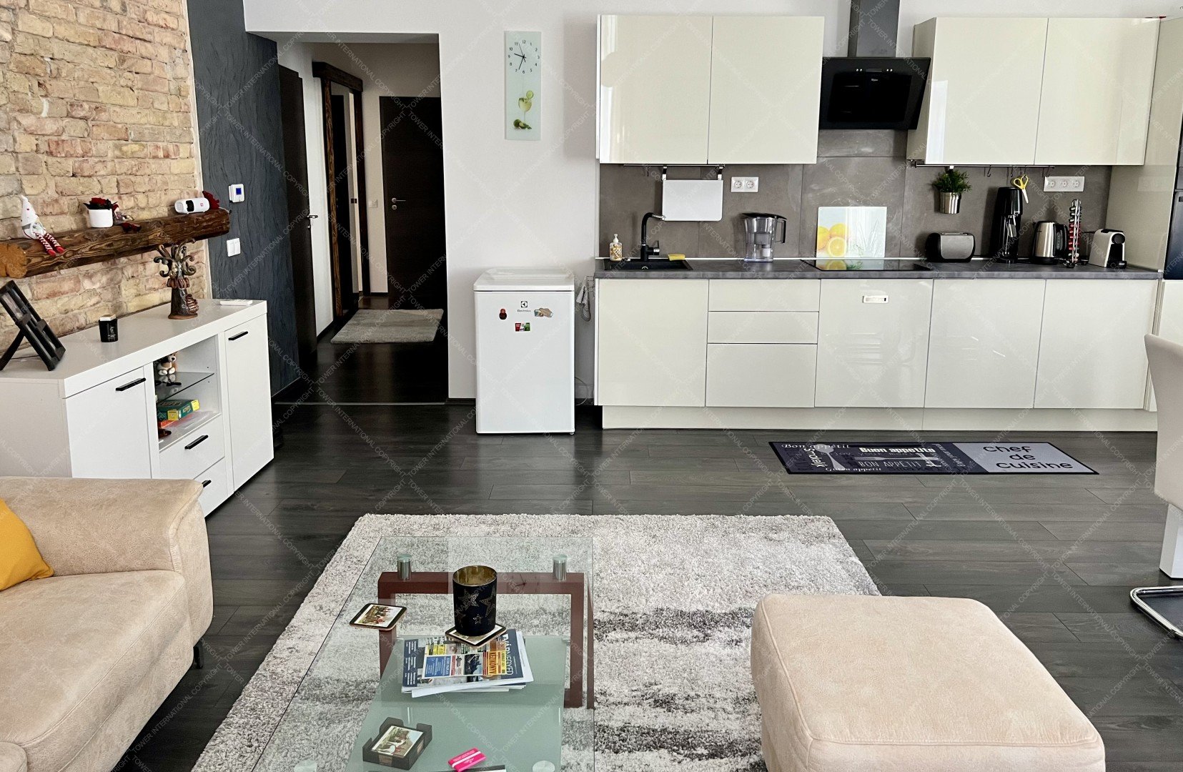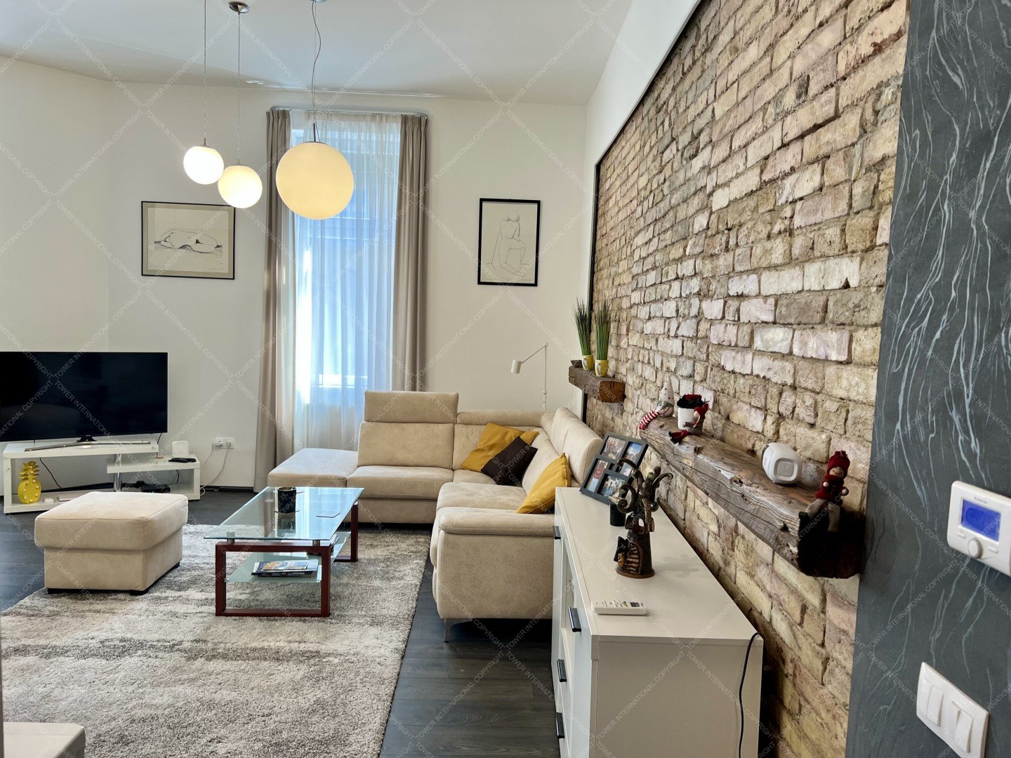 A special feature of the living room is a rustic brick wall treated with a stone-fix finish and side lighting, adding a unique atmosphere to the modern interior.