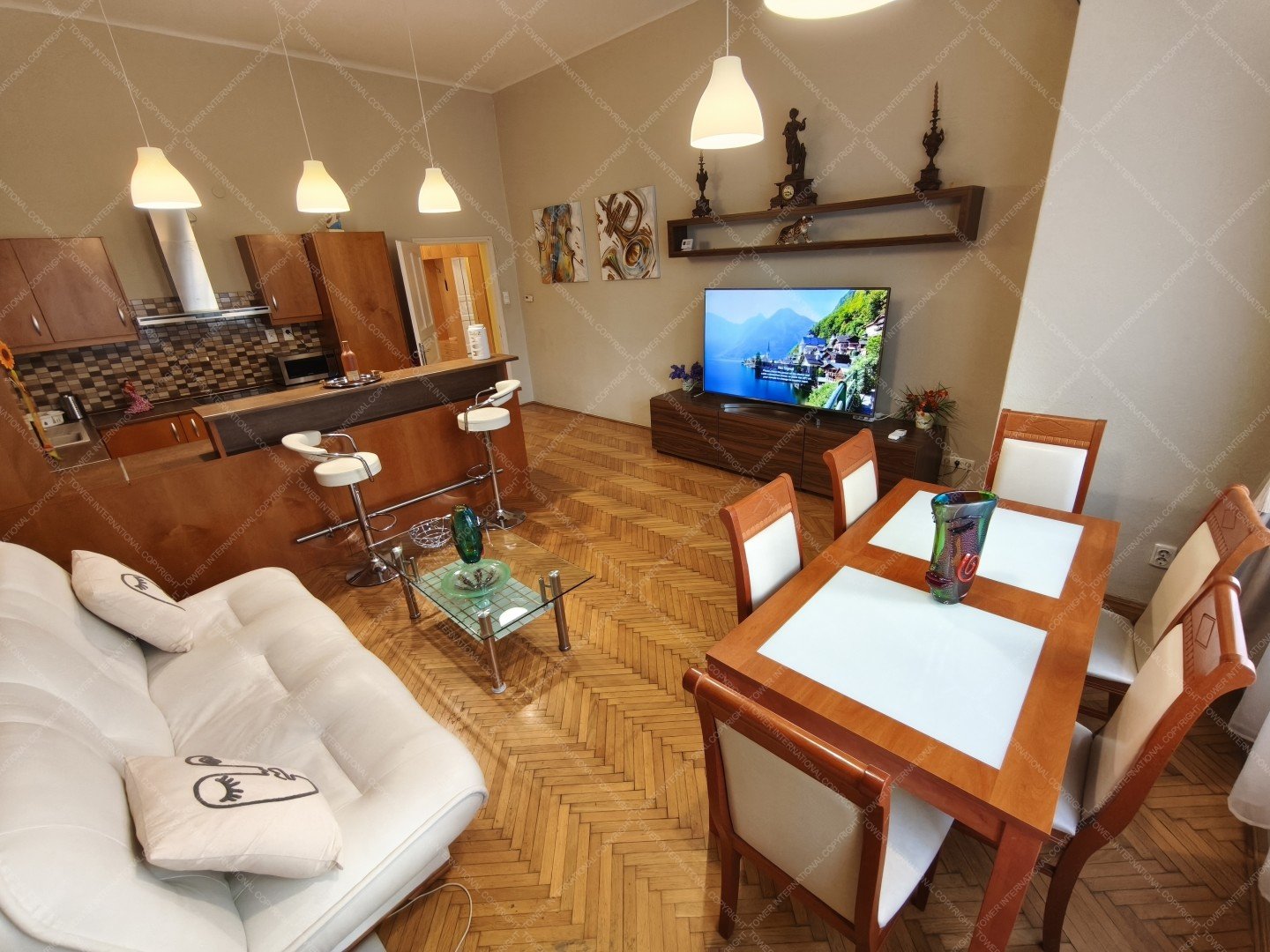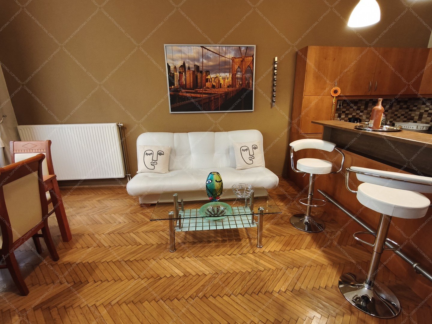 The property features a spacious living room with an American-style kitchen and two separate bedrooms, offering an ideal layout for couples, families, or anyone seeking a comfortable home in the city center.