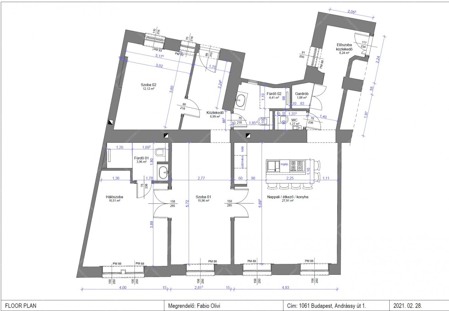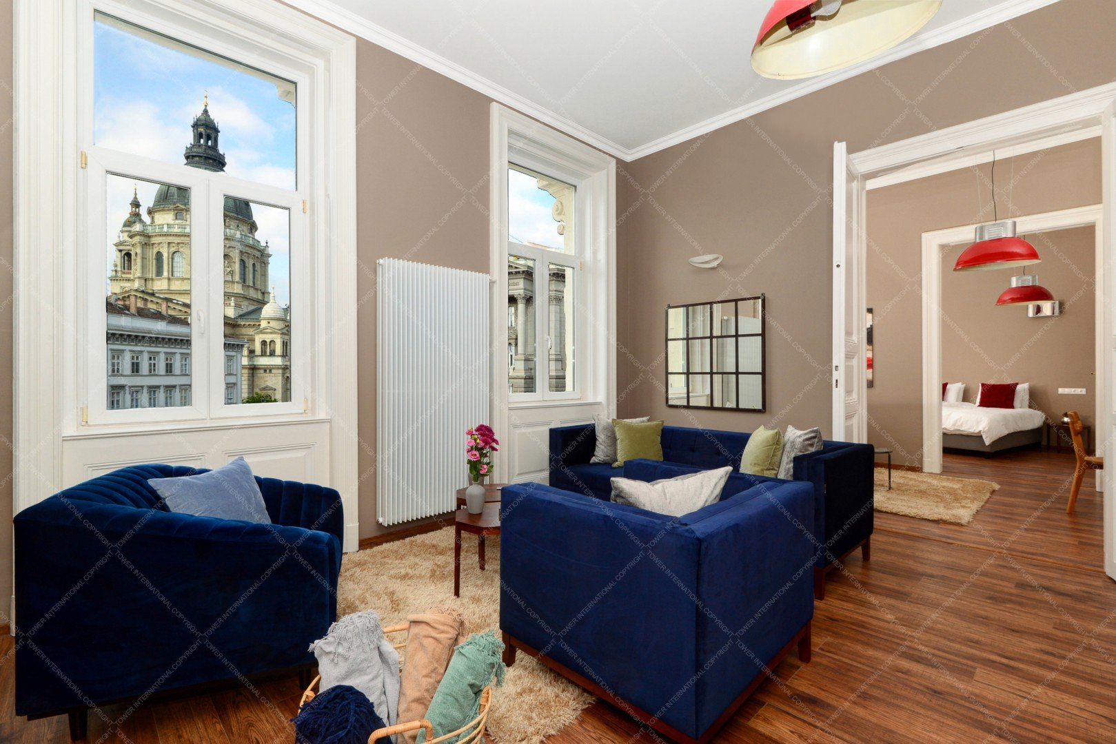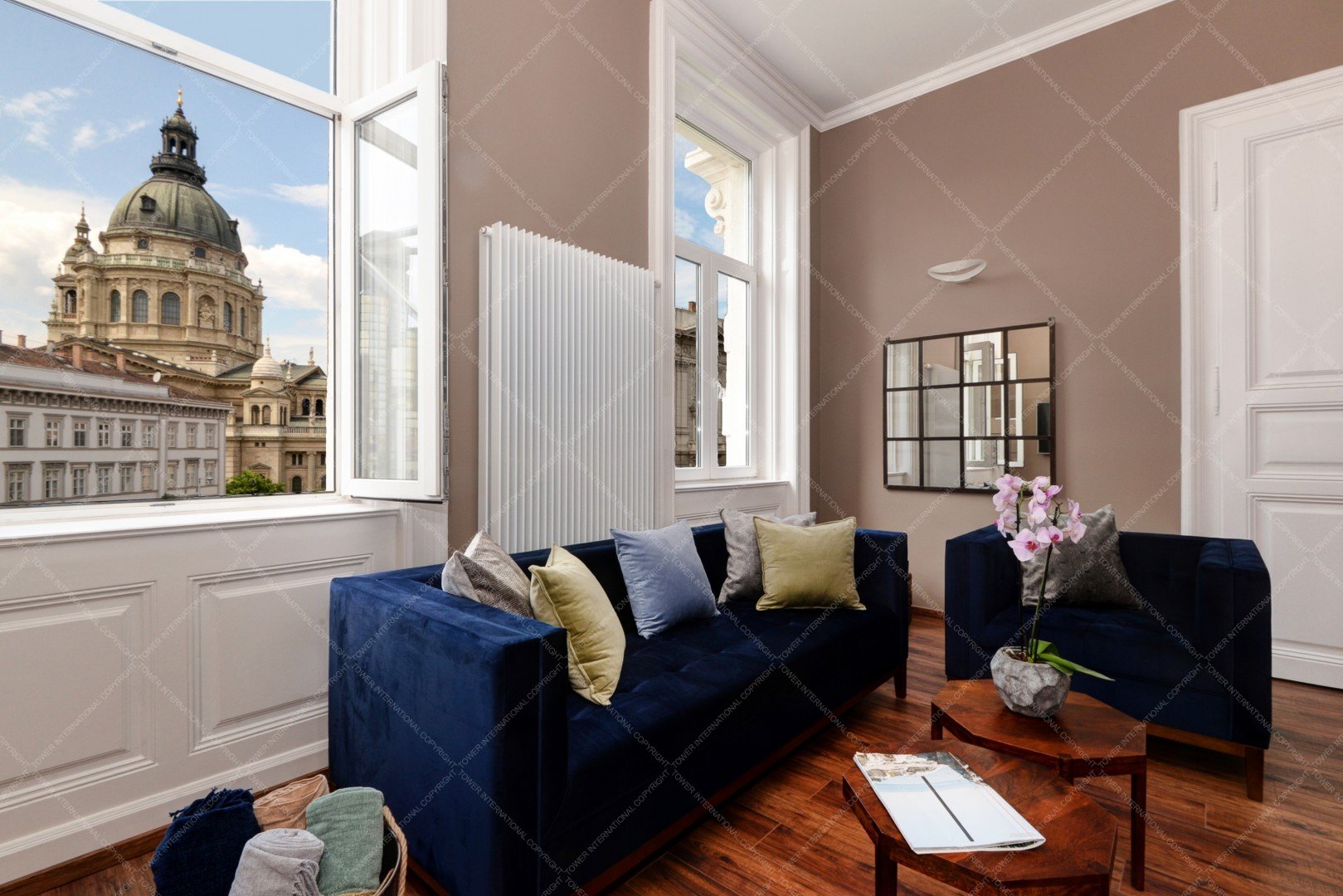 This Italian-style apartment on the Pest side, located on Andrássy Avenue, is 100 sqm with four windows facing Andrássy Avenue, as you can see from the pictures. It features two bedrooms, three bathrooms, a large living room, and a kitchen with an island. The apartment is fully restructured and furnished, offering a modern and elegant interior with a spectacular view of St. Stephen’s Basilica.