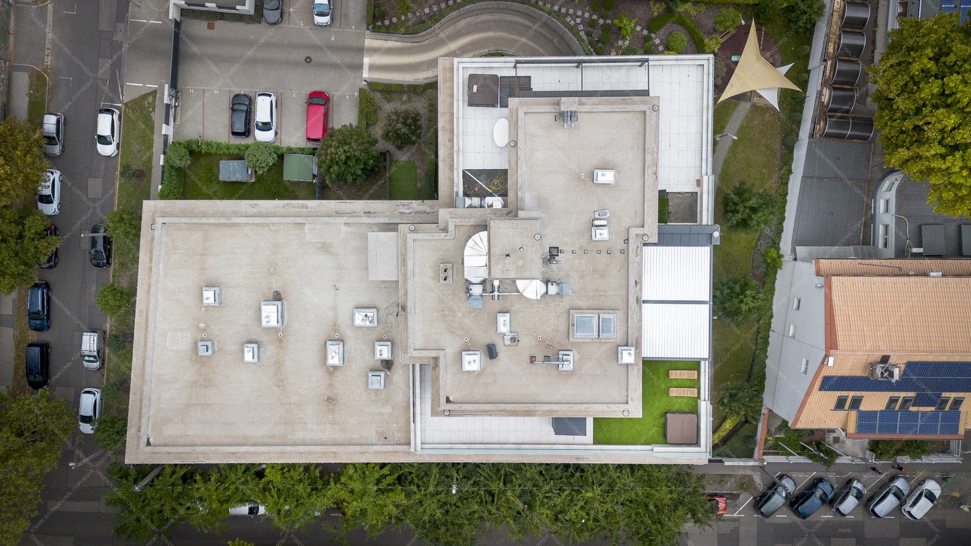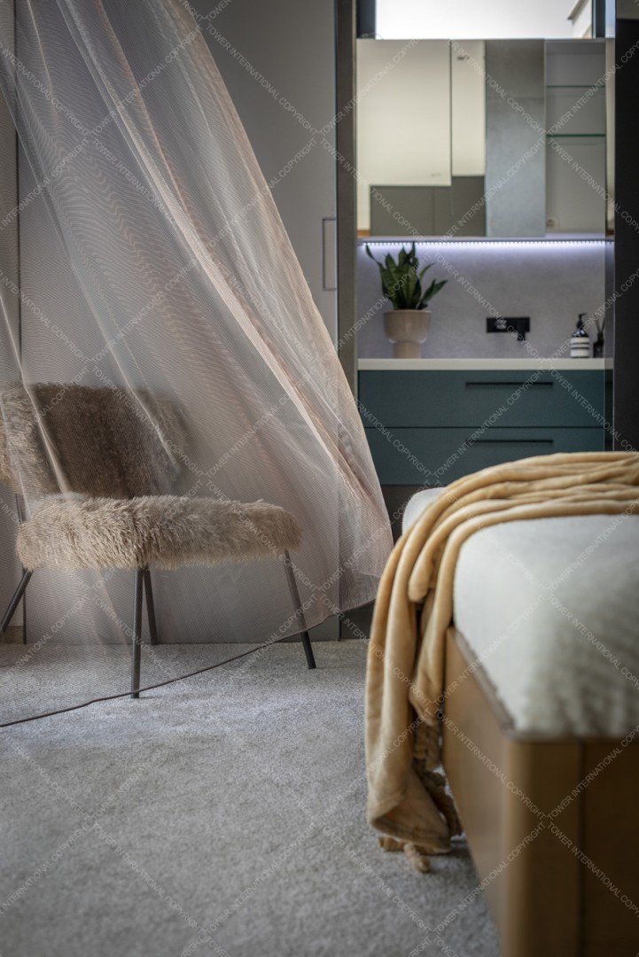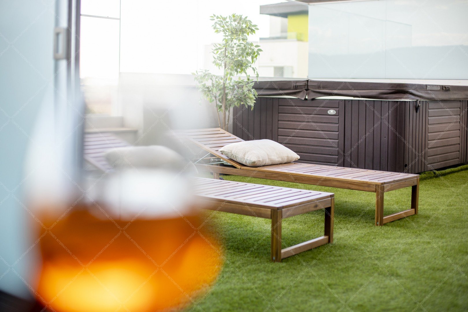 The roof terrace features a summer kitchen, jacuzzi, and sun loungers for the comfort of residents.