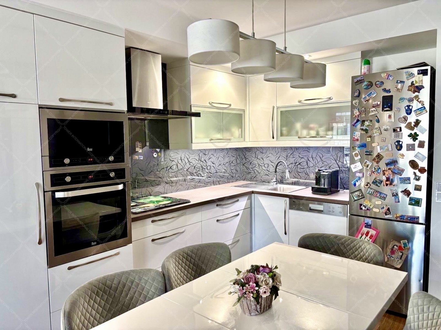 Fully equipped kitchen and household appliances: built-in hob, oven, microwave, extractor, dishwasher, fridge, washing machine, dryer