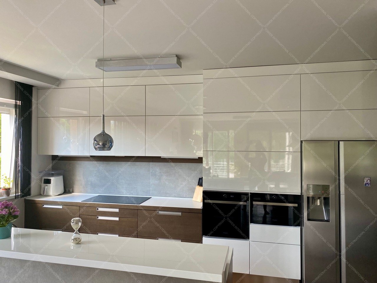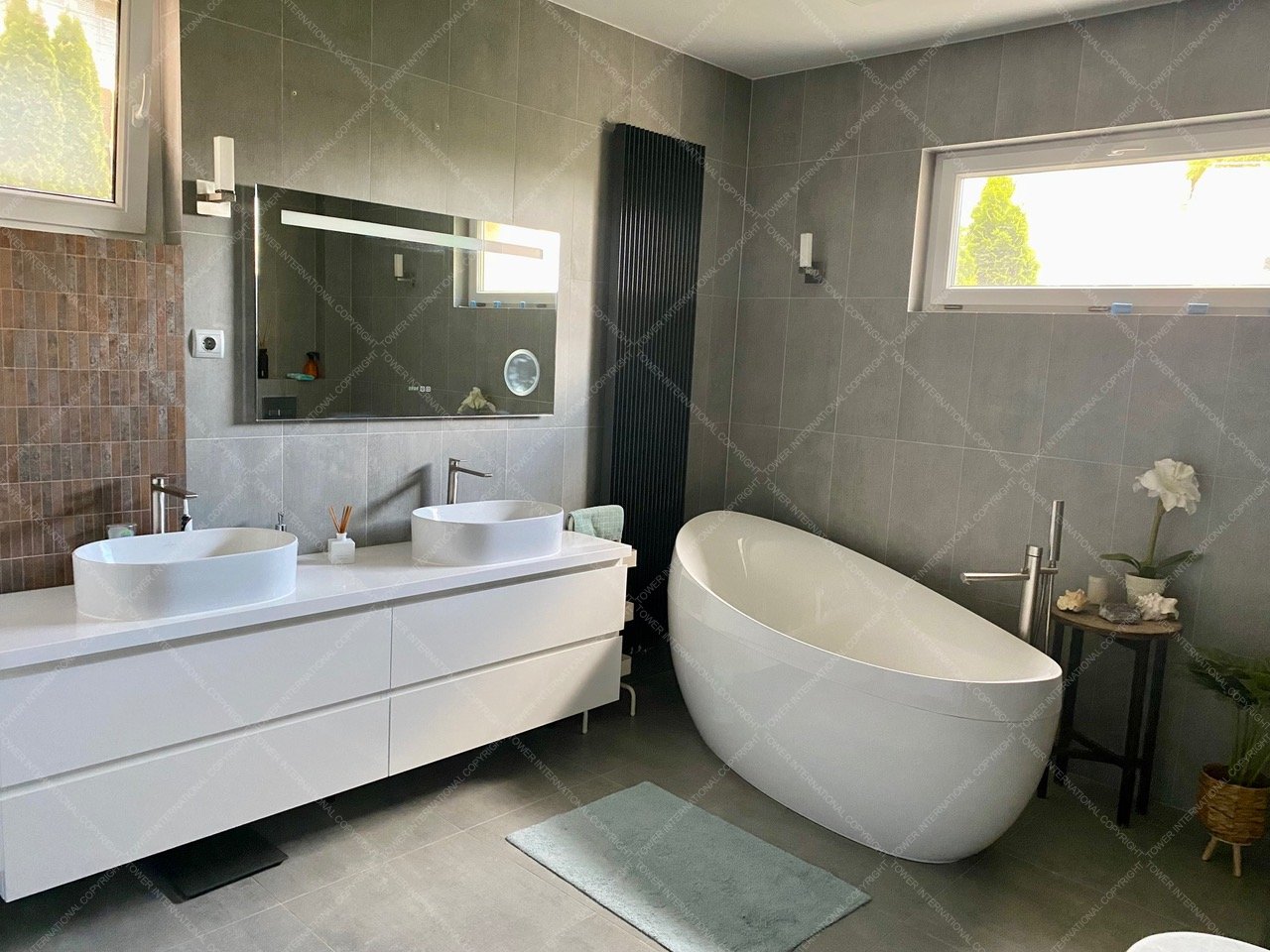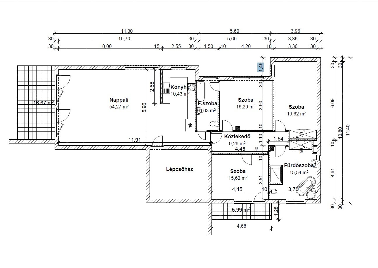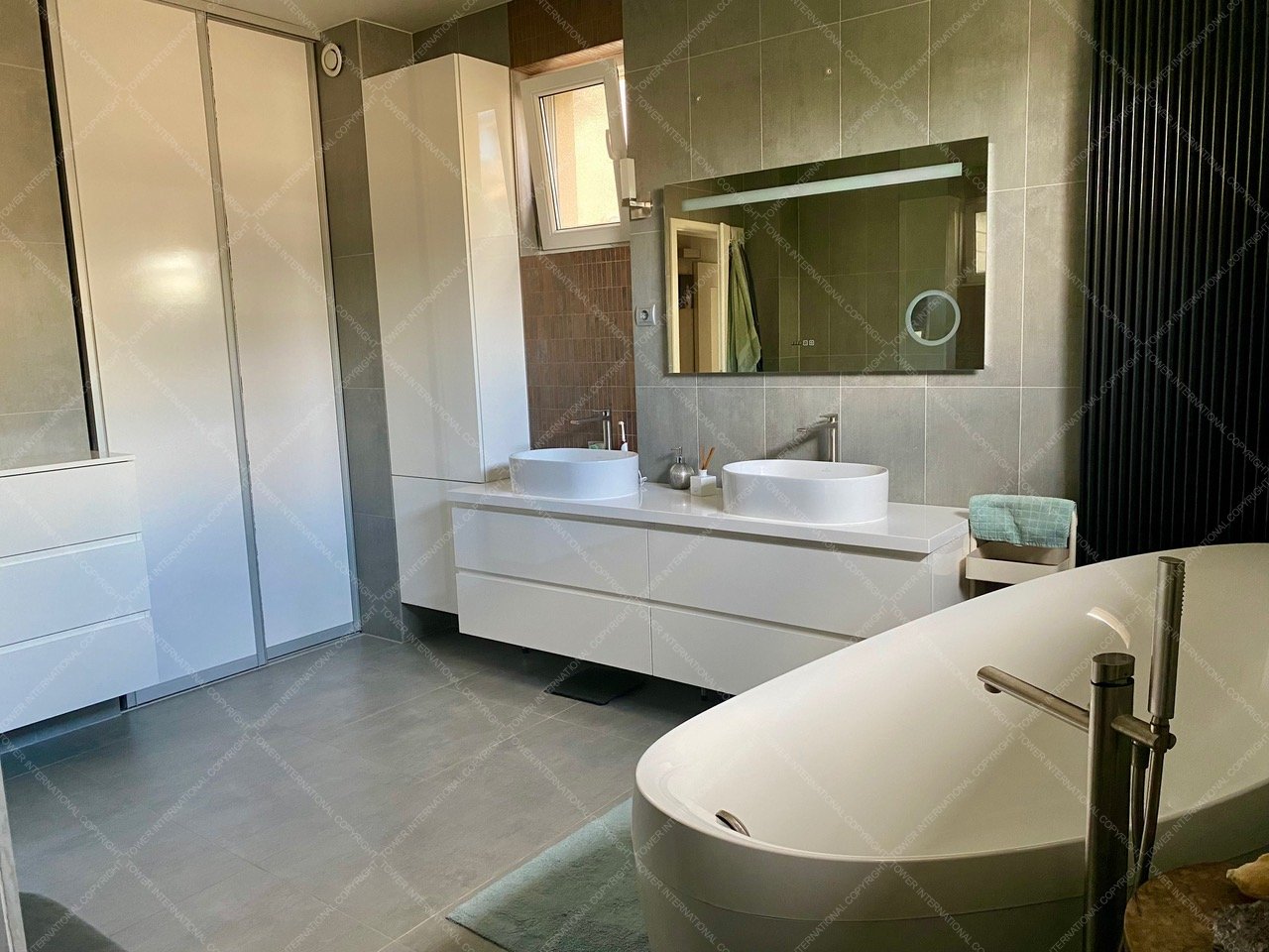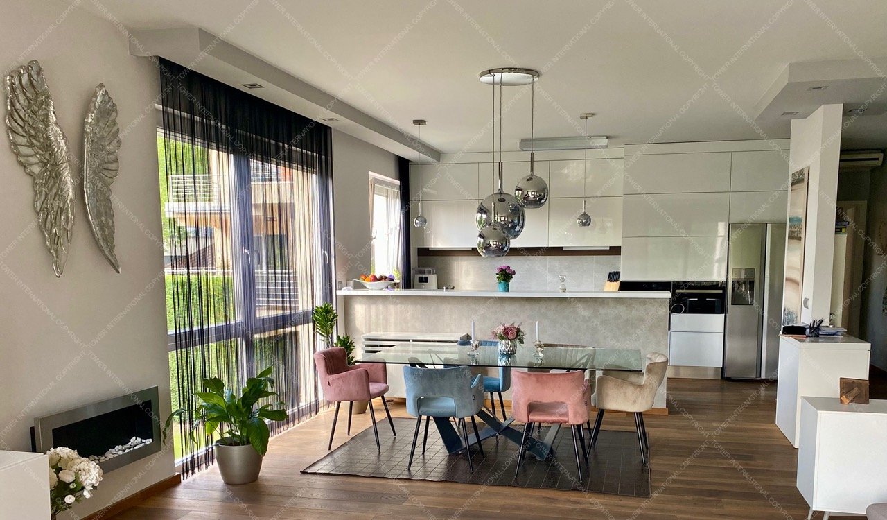 Elosztás: 3 hálószoba, 2 fürdőszoba, valamint egy 75 m²-es amerikai konyhás nappali