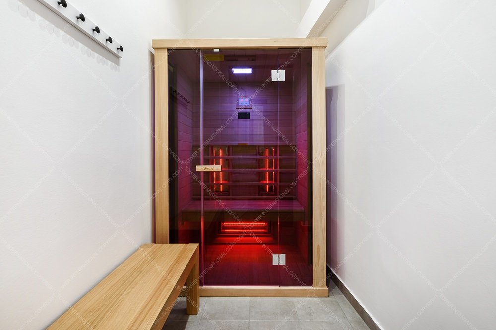 The furnished, air-conditioned property includes a living room-dining room-kitchen, 2 bathrooms, a walk-in closet, an infrared sauna, and a balcony.