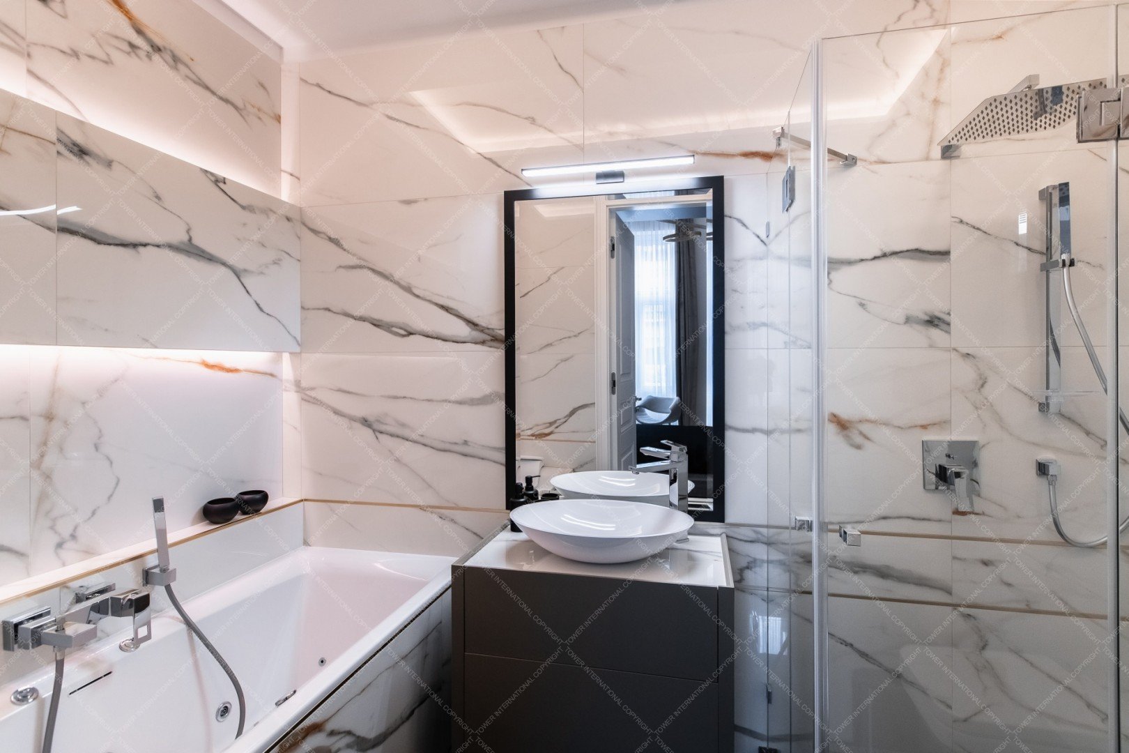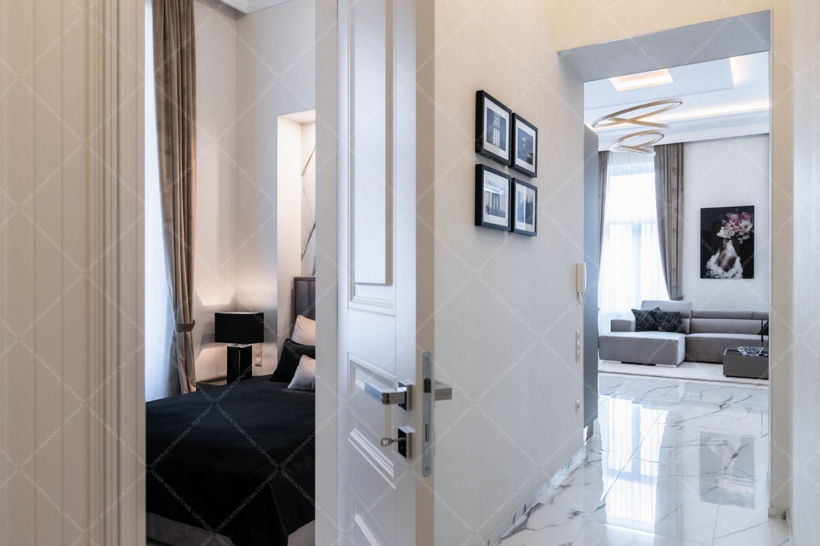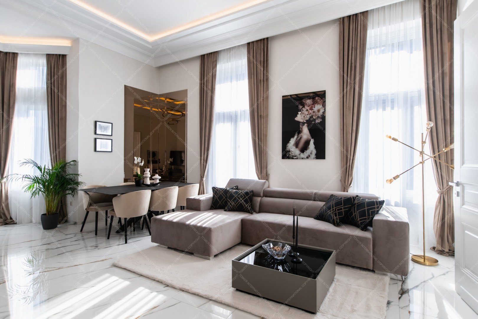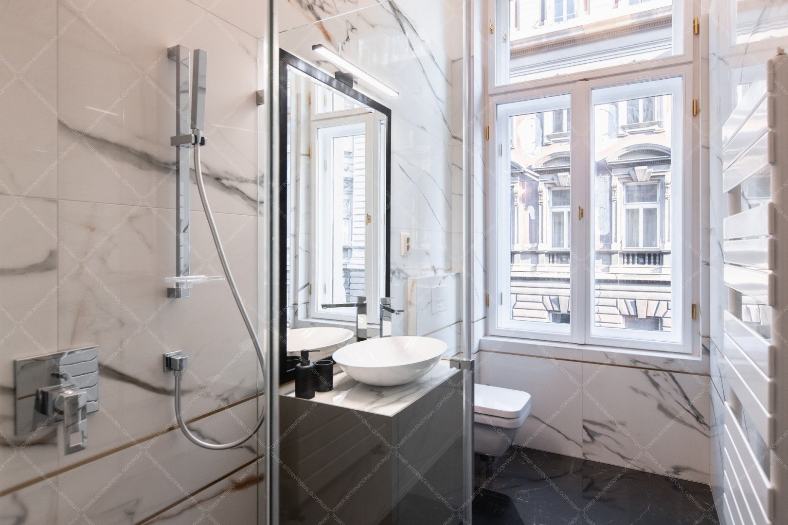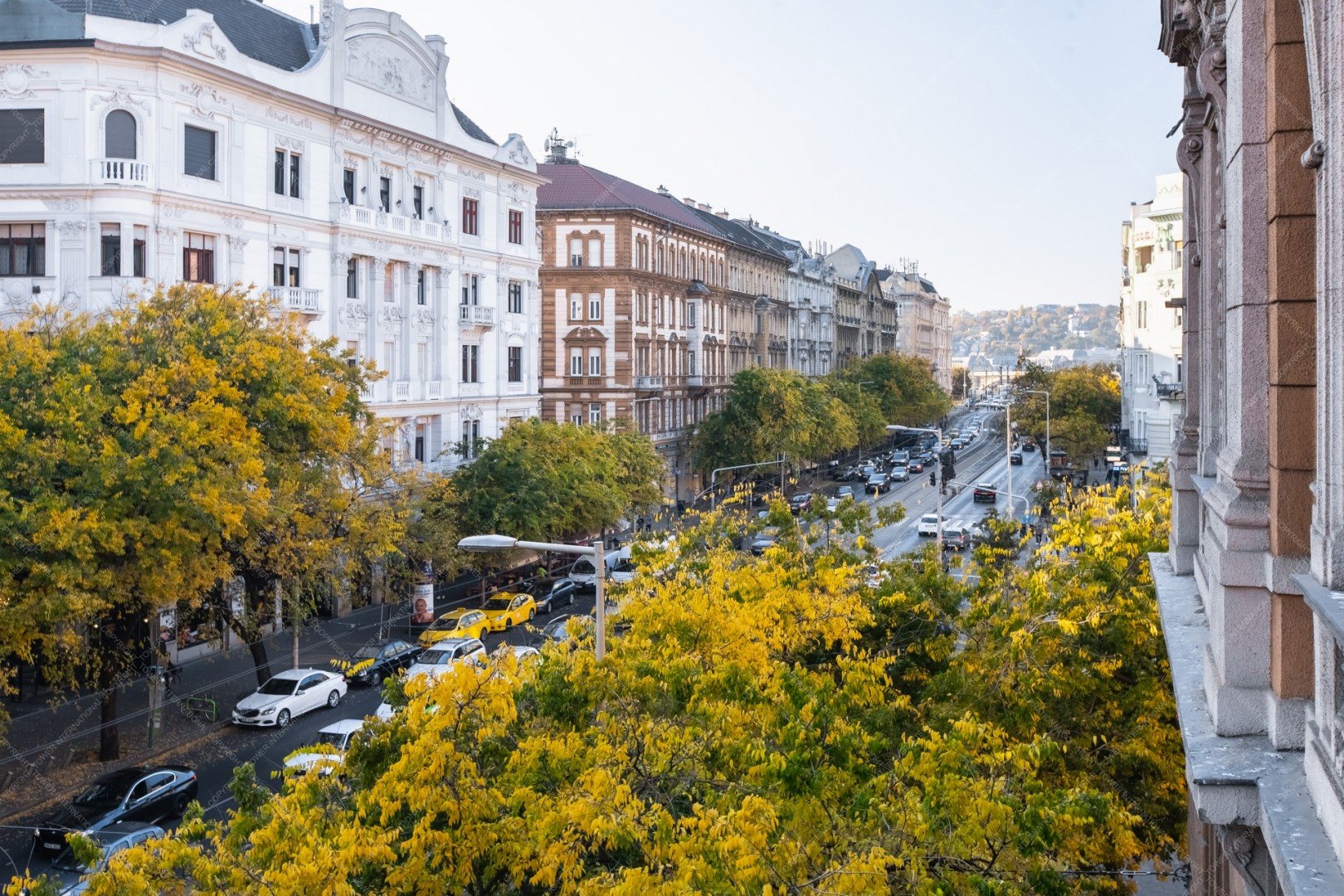 It has 2 bedrooms and 2 bathrooms. The rent is €2,500. It is located in the heart of the city, close to Margaret Island and Nyugati Railway Station, with many restaurants and shops nearby.