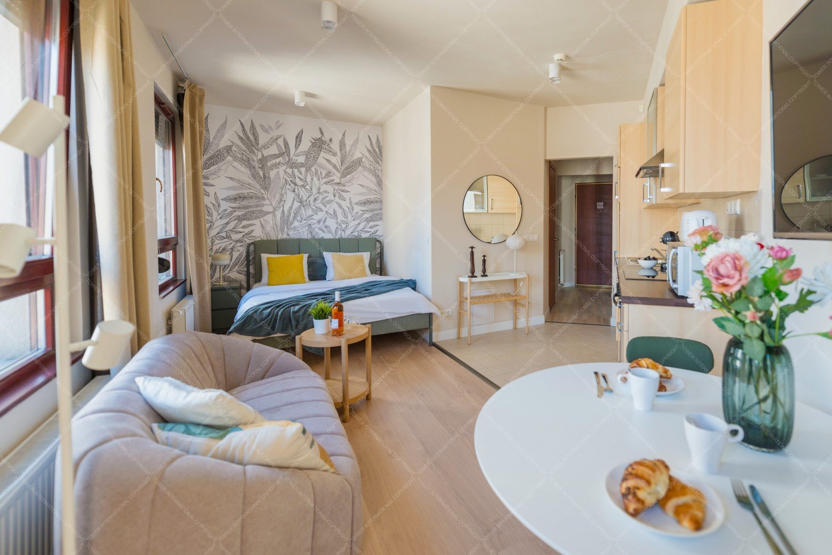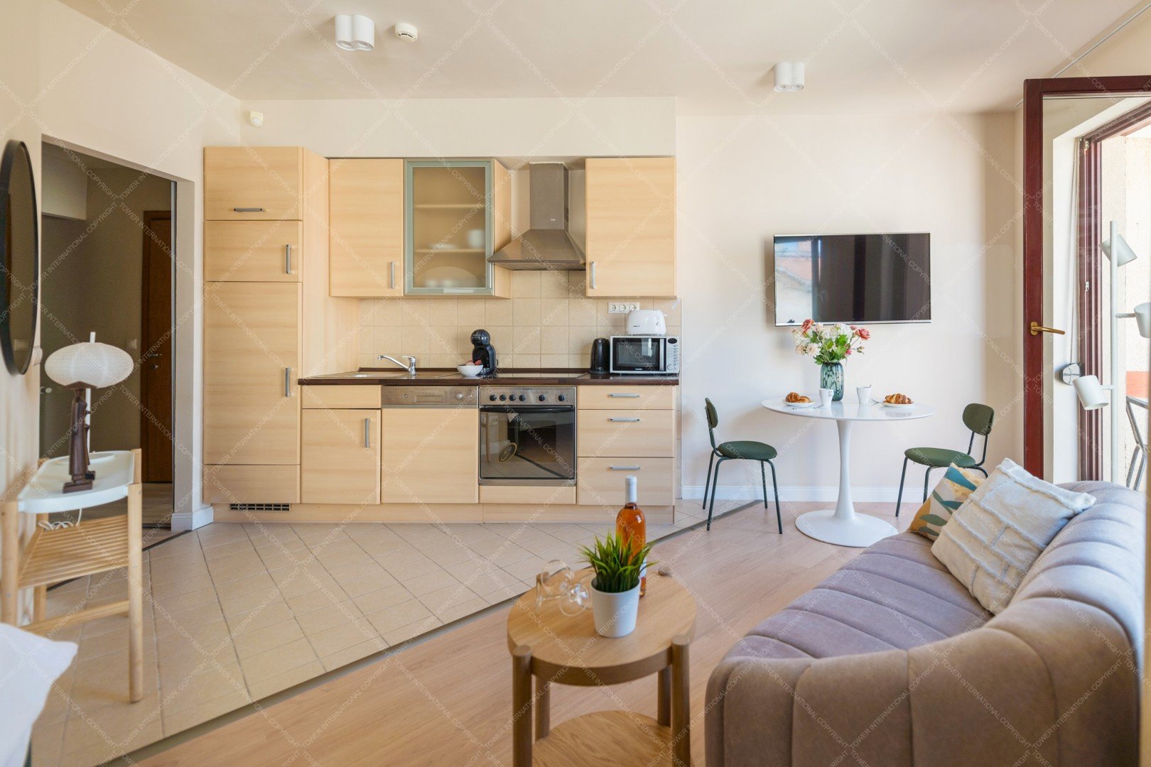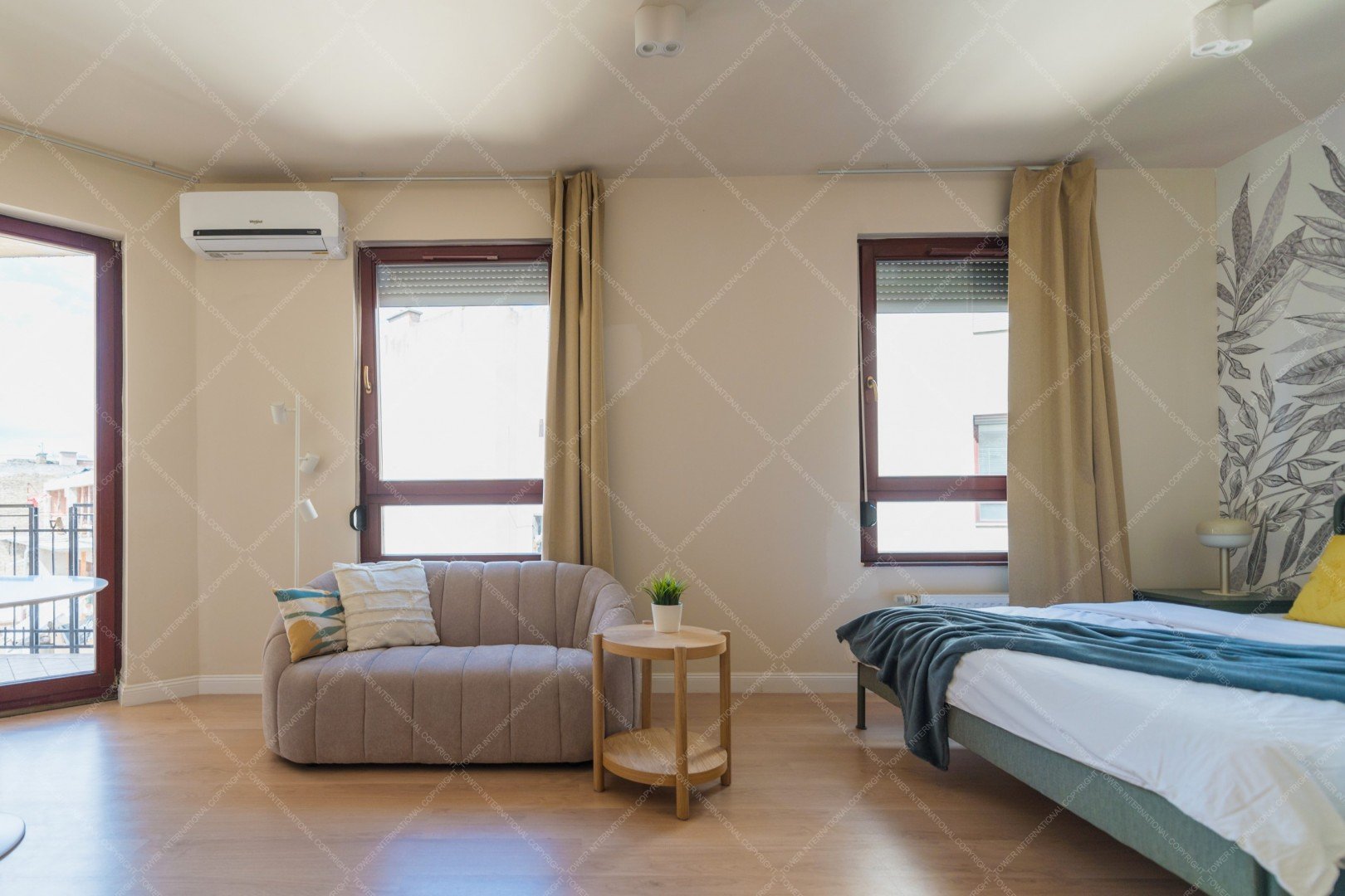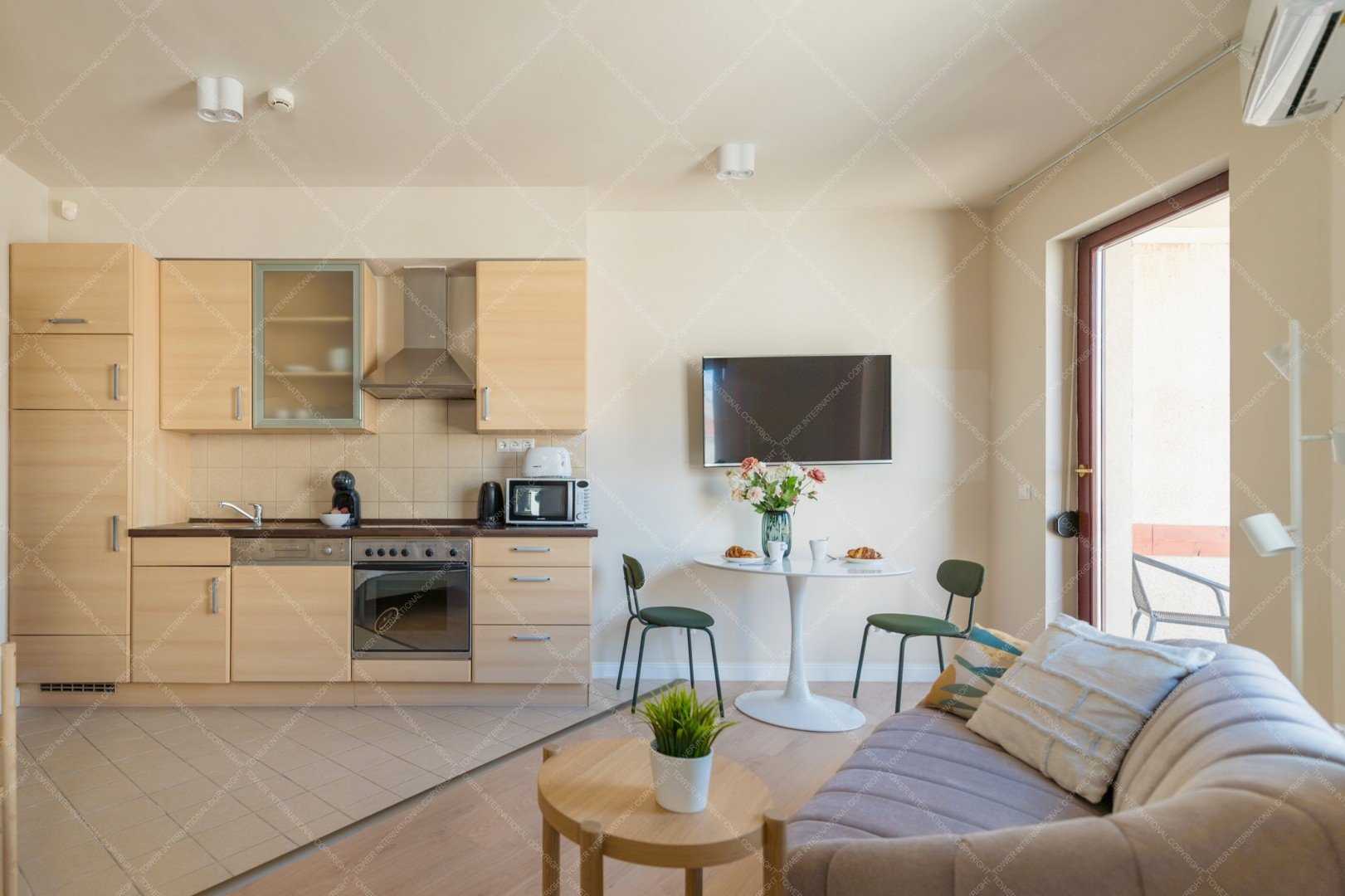 A modern 32 sqm one-room apartment is available for rent in District VI of Budapest, located at Király utca 30–32, B Tower. The apartment features an open-plan kitchen and a combined living and sleeping area, with the bed included as part of the furnishing. A small private terrace provides a pleasant outdoor space. The property is equipped with inverter air conditioning, and internet access is included in the rental price. The monthly rent is 600 euros. Electricity costs depend on usage and are approximately 5,000–10,000 HUF per month, while the common cost is around 25,000–30,000 HUF per month, which includes heating and water. The apartment is available for a minimum rental period of 12 months and benefits from an excellent downtown location with great public transport connections and nearby amenities.