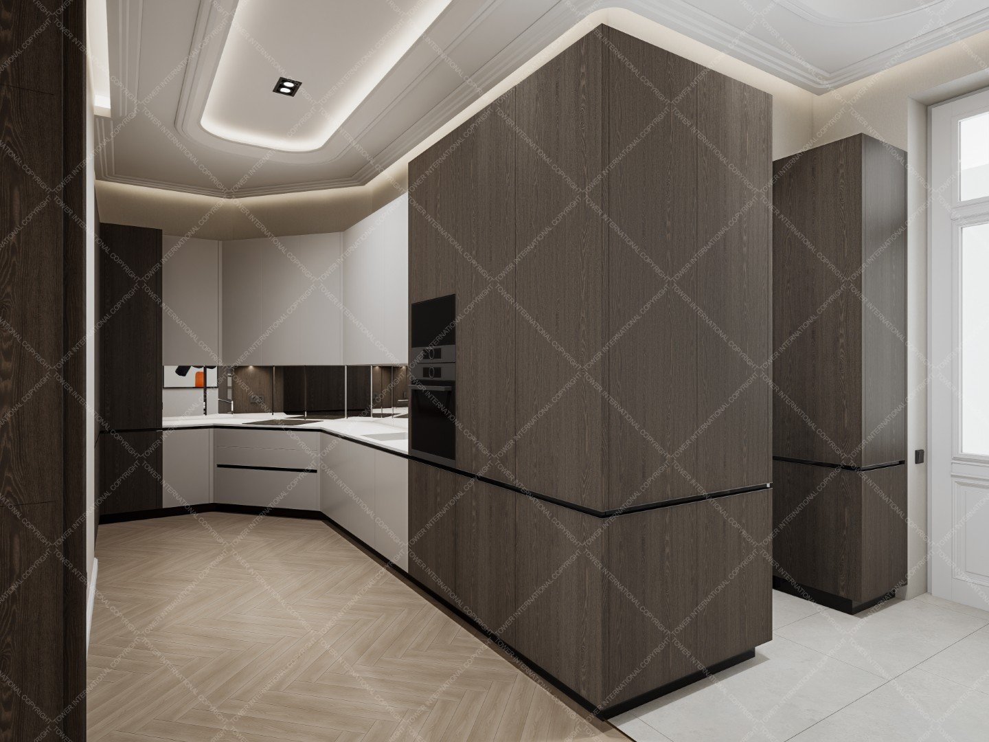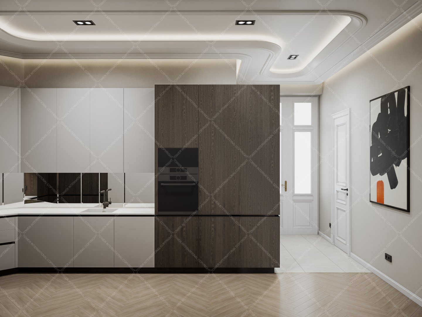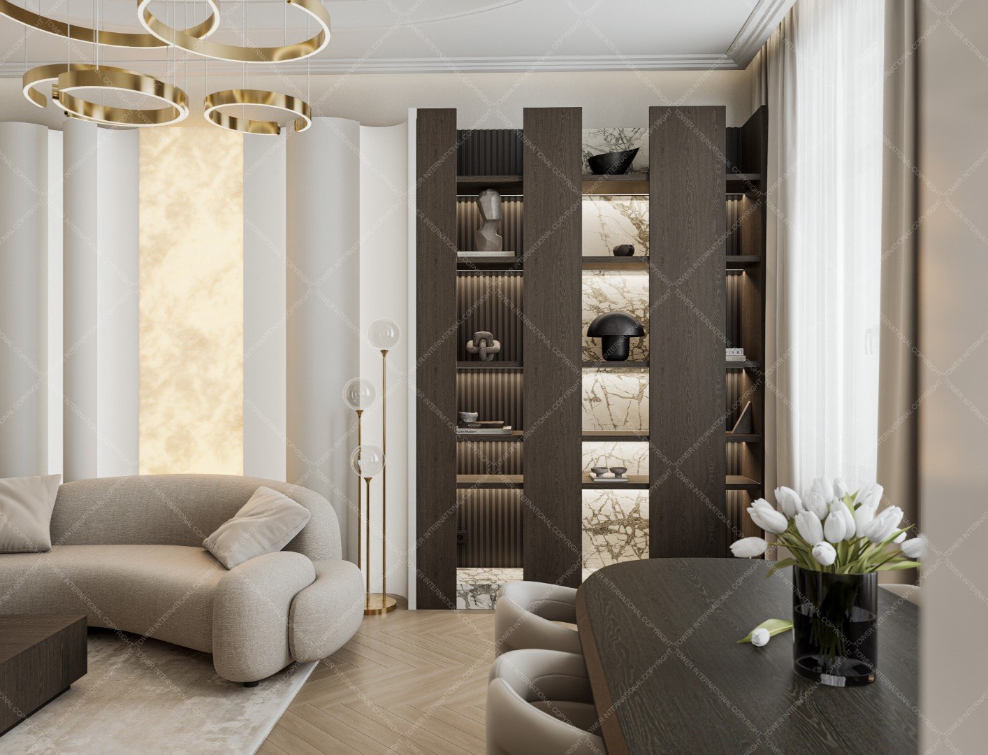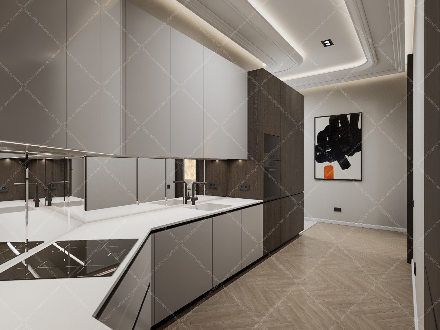 Other prominent elements of the rooms are the designer dressers and wardrobes made on the basis of unique plans, which provide plenty of storage space. The apartment is fully mechanized, with a washing machine, built-in kitchen, air conditioners and wall heating.